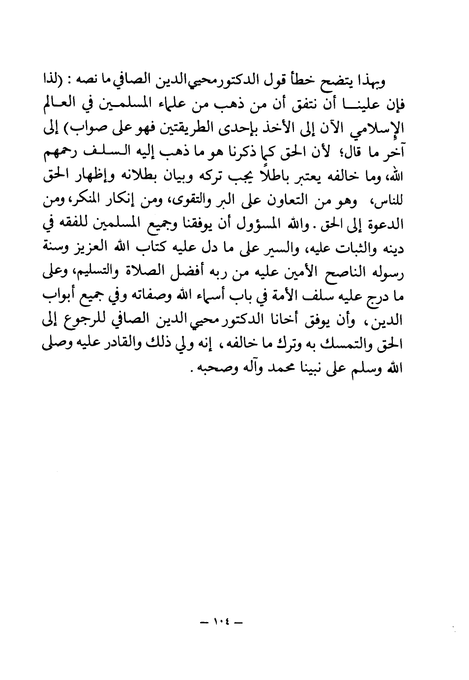 والله المسئول أن يوفقنا وجميع المسلمين للفقه في دينه والثبات عليه، والسير على ما دل عليه كتاب الله العزيز وسنة رسوله الناصح الأمين عليه من ربه أفضل الصلاة والتسليم، وعلى ما درج عليه سلف الأمة في باب أسماء الله وصفاته وفي جميع أبواب الدين، وأن يوفق أخانا الدكتور محيي الدين الصافي للرجوع إلى الحق والتمسك به وترك ما خالفه، إنه ولي ذلك والقادر عليه وصلى الله وسلم على نبينا محمد وآله وصحبه.
