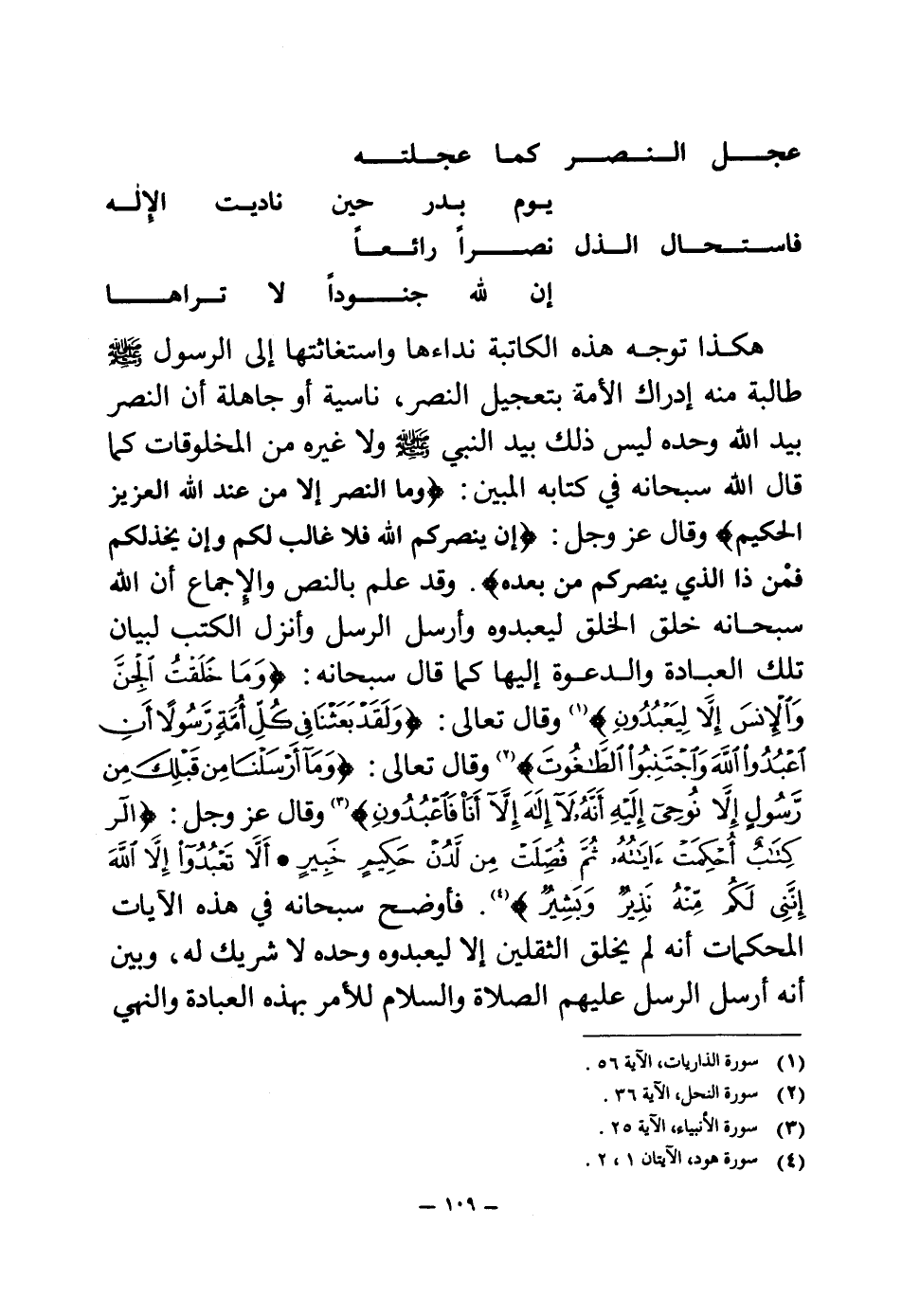 هكذا توجه هذه الكاتبة نداءها واستغاثتها إلى الرسول صلى الله عليه وسلم طالبة منه إدراك الأمة بتعجيل النصر، ناسية أو جاهلة أن النصر بيد الله وحده ليس ذلك بيد النبي صلى الله عليه وسلم ولا غيره من المخلوقات كما قال الله سبحانه في كتابه المبين: {وَمَا النَّصْرُ إِلَّا مِنْ عِنْدِ اللَّهِ الْعَزِيزِ الْحَكِيمِ} (¬1) وقال عز وجل: {إِنْ يَنْصُرْكُمُ اللَّهُ فَلَا غَالِبَ لَكُمْ وَإِنْ يَخْذُلْكُمْ فَمَنْ ذَا الَّذِي يَنْصُرُكُمْ مِنْ بَعْدِهِ} (¬2)