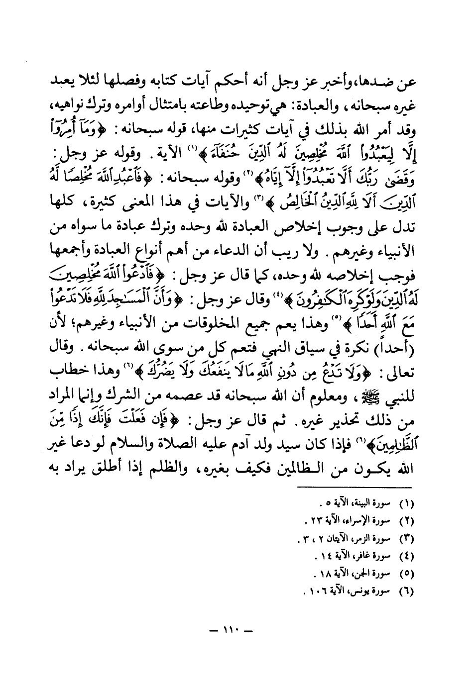 عن ضدها، وأخبر عز وجل أنه أحكم آيات كتابه وفصلها لئلا يعبد غيره سبحانه، والعبادة: هي توحيده وطاعته بامتثال أوامره وترك نواهيه، وقد أمر الله بذلك في آيات كثيرات منها، قوله سبحانه: {وَمَا أُمِرُوا إِلَّا لِيَعْبُدُوا اللَّهَ مُخْلِصِينَ لَهُ الدِّينَ حُنَفَاءَ} (¬1) الآية. وقوله عز وجل: {وَقَضَى رَبُّكَ أَلَّا تَعْبُدُوا إِلَّا إِيَّاهُ} (¬2) وقوله سبحانه: {فَاعْبُدِ اللَّهَ مُخْلِصًا لَهُ الدِّينَ} (¬3) {أَلَا لِلَّهِ الدِّينُ الْخَالِصُ} (¬4) والآيات في هذا المعنى كثيرة، كلها تدل على وجوب إخلاص العبادة لله وحده وترك عبادة ما سواه من الأنبياء وغيرهم.