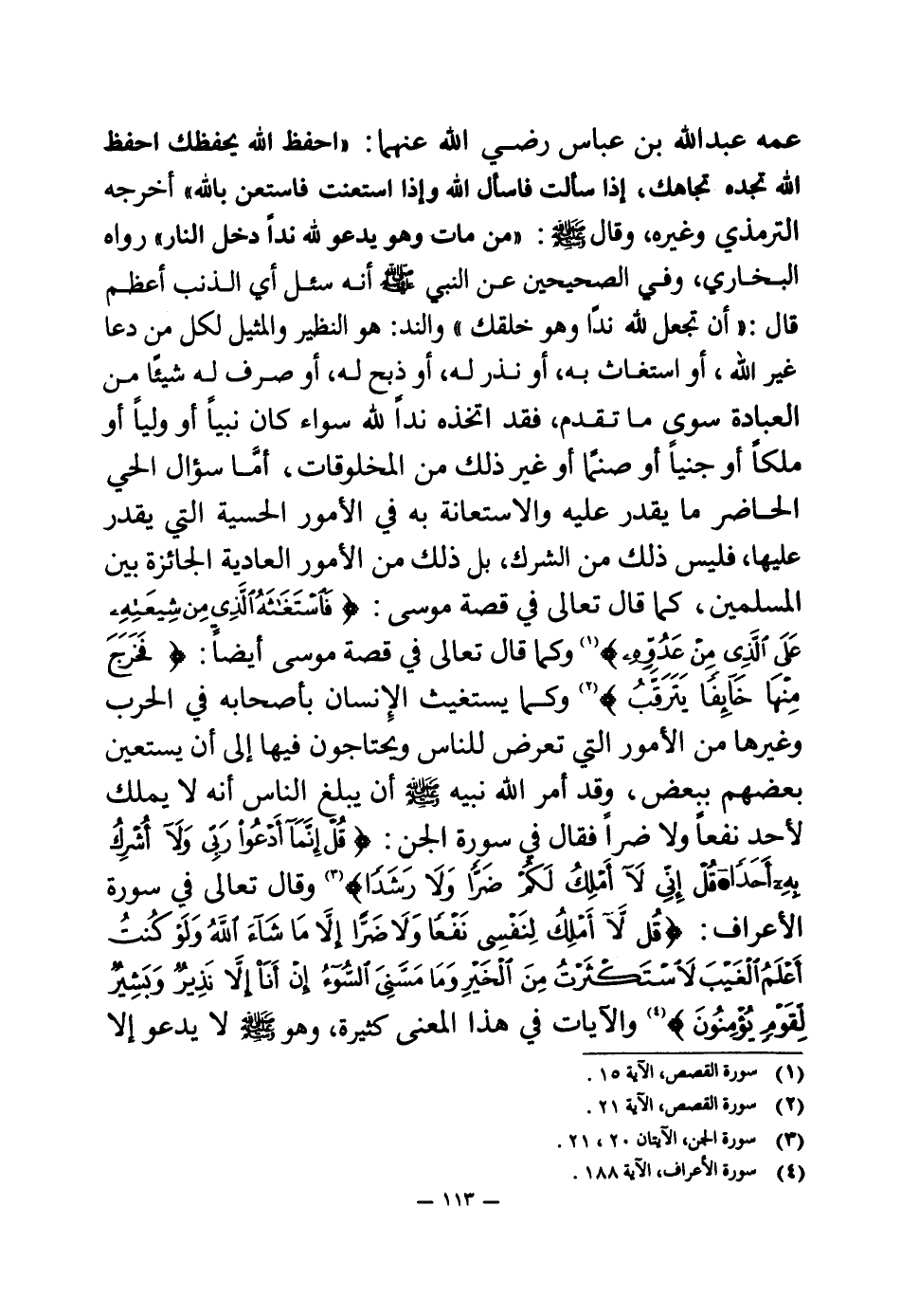 عمه عبد الله بن عباس رضي الله عنهم «احفظ الله يحفظك احفظ الله تجده تجاهك إذا سألت فاسأل الله وإذا استعنت فاستعن بالله (¬1) » أخرجه الترمذي وغيره، وقال صلى الله عليه وسلم: «من مات وهو يدعو لله ندا دخل النار (¬2) » رواه البخاري، وفي الصحيحين عن النبي صلى الله عليه وسلم أنه سئل «أي الذنب أعظم؟ قال: أن تجعل لله ندا وهو خلقك (¬3) » والند: هو النظير والمثيل لكل من دعا غير الله، أو استغاث به، أو نذر له، أو ذبح له، أو صرف له شيئا من العبادة سوى ما تقدم، فقد اتخذه ندا لله سواء كان نبيا أو وليا أو ملكا أو جنيا أو صنما أو غير ذلك من المخلوقات. أما سؤال الحي الحاضر ما يقدر عليه والاستعانة به في الأمور الحسية التي يقدر عليها، فليس ذلك من الشرك، بل ذلك من الأمور العادية الجائزة بين المسلمين، كما قال تعالى في قصة موسى: {فَاسْتَغَاثَهُ الَّذِي مِنْ شِيعَتِهِ عَلَى الَّذِي مِنْ عَدُوِّهِ} (¬4) وكما قال تعالى في قصة موسى أيضا: {فَخَرَجَ مِنْهَا خَائِفًا يَتَرَقَّبُ} (¬5) وكما يستغيث الإنسان بأصحابه في الحرب وغيرها من الأمور التي تعرض للناس ويحتاجون فيها إلى أن يستعين بعضهم ببعض، وقد أمر الله نبيه صلى الله عليه وسلم أن يبلغ الناس أنه لا يملك لأحد نفعا ولا ضرا فقال في سورة الجن: {قُلْ إِنَّمَا أَدْعُو رَبِّي وَلَا أُشْرِكُ بِهِ أَحَدًا} (¬6) {قُلْ إِنِّي لَا أَمْلِكُ لَكُمْ ضَرًّا وَلَا رَشَدًا} (¬7) وقال تعالى في سورة الأعراف: {قُلْ لَا أَمْلِكُ لِنَفْسِي نَفْعًا وَلَا ضَرًّا إِلَّا مَا شَاءَ اللَّهُ وَلَوْ كُنْتُ أَعْلَمُ الْغَيْبَ لَاسْتَكْثَرْتُ مِنَ الْخَيْرِ وَمَا مَسَّنِيَ السُّوءُ إِنْ أَنَا إِلَّا نَذِيرٌ وَبَشِيرٌ لِقَوْمٍ يُؤْمِنُونَ} (¬8) والآيات في هذا المعنى كثيرة، وهو صلى الله عليه وسلم لا يدعو إلا