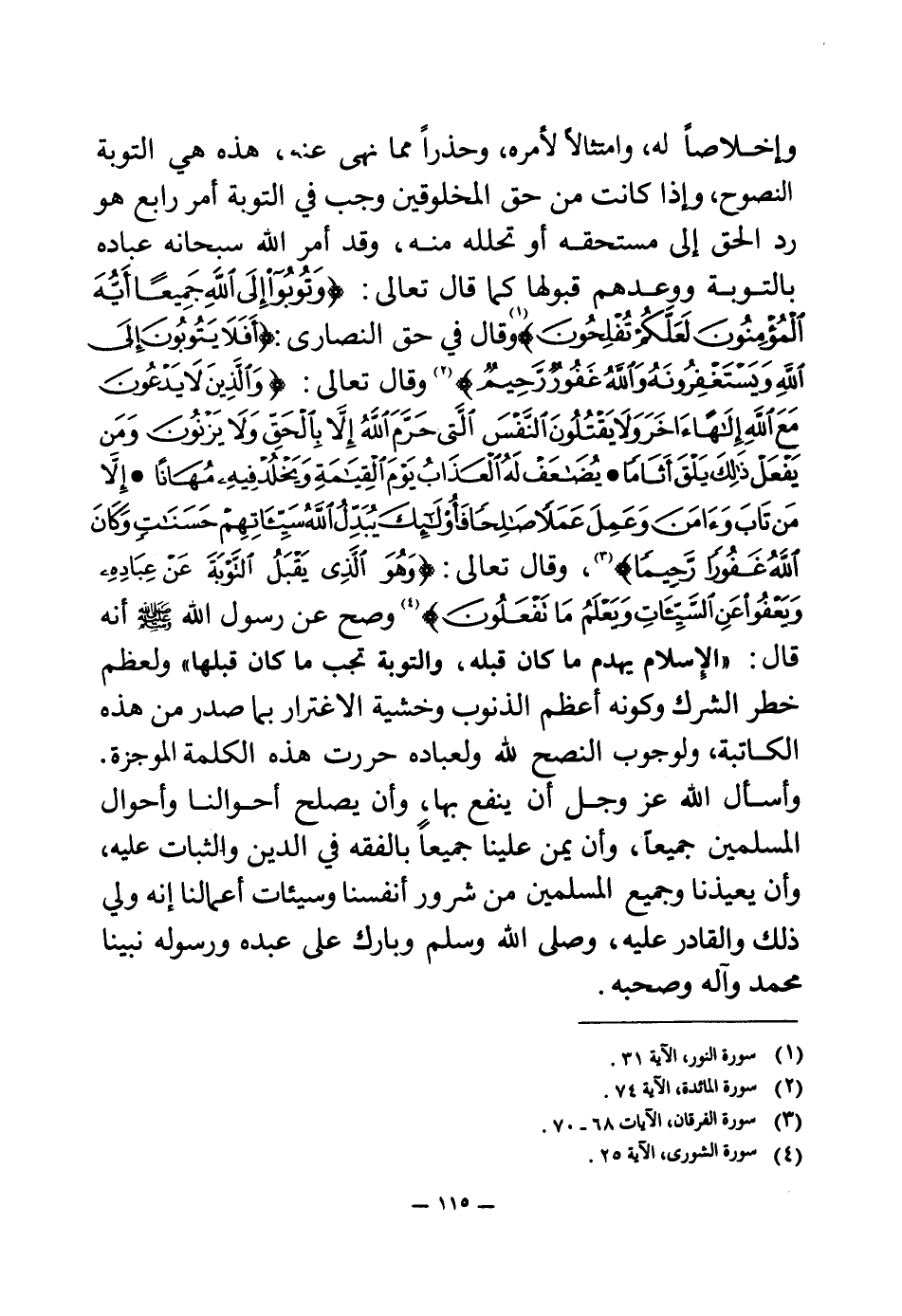 وإخلاصا له، وامتثالا لأمره، وحذرا مما نهى عنه، هذه هي التوبة النصوح، وإذا كانت من حق المخلوقين وجب في التوبة أمر رابع هو رد الحق إلى مستحقه أو تحلله منه، وقد أمر الله سبحانه عباده بالتوبة ووعدهم قبولها كما قال تعالى: {وَتُوبُوا إِلَى اللَّهِ جَمِيعًا أَيُّهَ الْمُؤْمِنُونَ لَعَلَّكُمْ تُفْلِحُونَ} (¬1) وقال في حق النصارى: {أَفَلَا يَتُوبُونَ إِلَى اللَّهِ وَيَسْتَغْفِرُونَهُ وَاللَّهُ غَفُورٌ رَحِيمٌ} (¬2) وقال تعالى: {وَالَّذِينَ لَا يَدْعُونَ مَعَ اللَّهِ إِلَهًا آخَرَ وَلَا يَقْتُلُونَ النَّفْسَ الَّتِي حَرَّمَ اللَّهُ إِلَّا بِالْحَقِّ وَلَا يَزْنُونَ وَمَنْ يَفْعَلْ ذَلِكَ يَلْقَ أَثَامًا} (¬3) {يُضَاعَفْ لَهُ الْعَذَابُ يَوْمَ الْقِيَامَةِ وَيَخْلُدْ فِيهِ مُهَانًا} (¬4) {إِلَّا مَنْ تَابَ وَآمَنَ وَعَمِلَ عَمَلًا صَالِحًا فَأُولَئِكَ يُبَدِّلُ اللَّهُ سَيِّئَاتِهِمْ حَسَنَاتٍ وَكَانَ اللَّهُ غَفُورًا رَحِيمًا} (¬5) وقال تعالى: {وَهُوَ الَّذِي يَقْبَلُ التَّوْبَةَ عَنْ عِبَادِهِ وَيَعْفُو عَنِ السَّيِّئَاتِ وَيَعْلَمُ مَا تَفْعَلُونَ} (¬6) وصح عن رسول الله صلى الله عليه وسلم أنه قال: «الإسلام يهدم ما كان قبله والتوبة تجب ما كان قبلها (¬7) » ولعظم خطر الشرك وكونه أعظم الذنوب وخشية الاغترار بما صدر من هذه الكاتبة، ولوجوب النصح لله ولعباده حررت هذه الكلمة الموجزة.