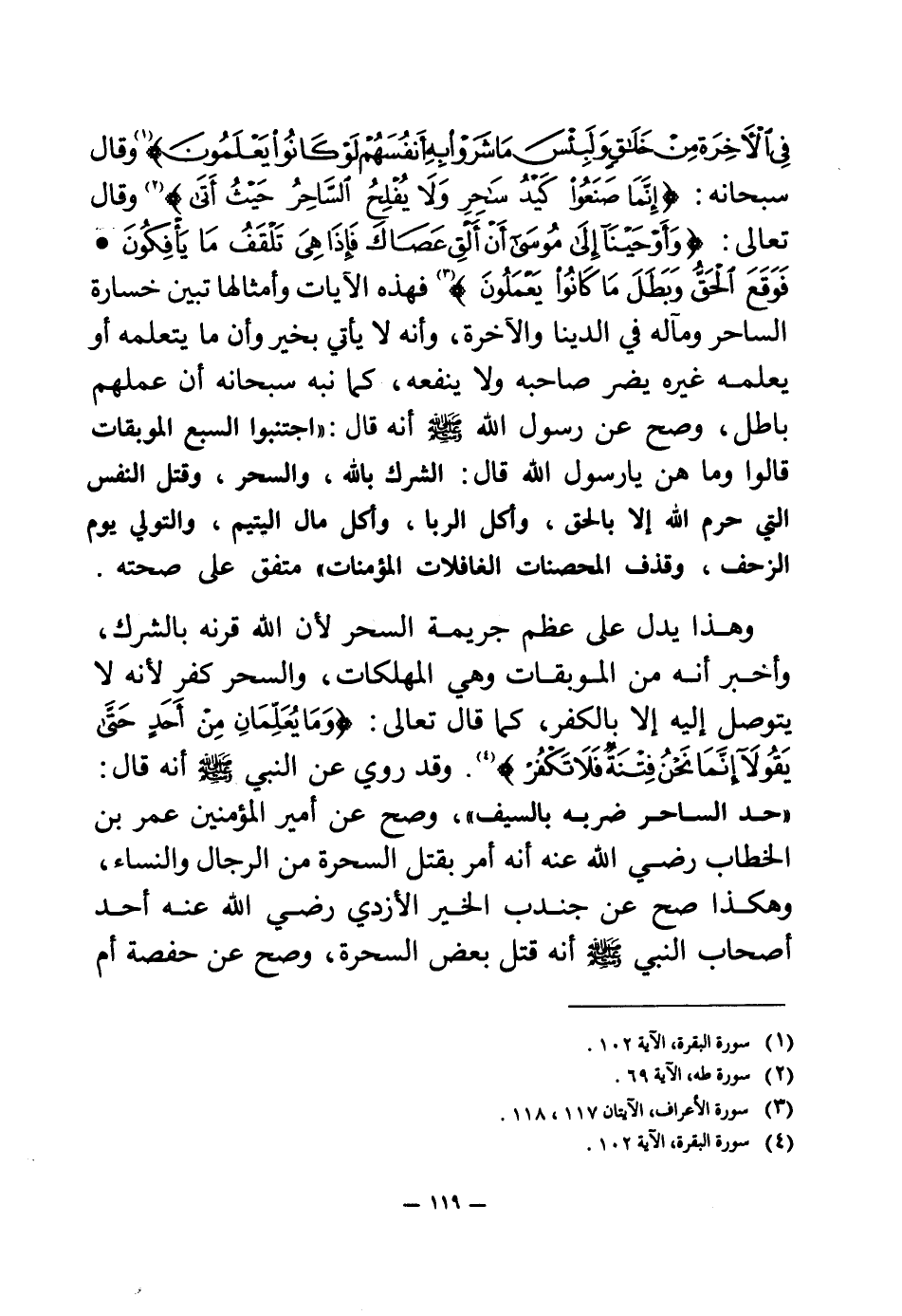 وقال سبحانه: {إِنَّمَا صَنَعُوا كَيْدُ سَاحِرٍ وَلَا يُفْلِحُ السَّاحِرُ حَيْثُ أَتَى} (¬1) وقال تعالى: {وَأَوْحَيْنَا إِلَى مُوسَى أَنْ أَلْقِ عَصَاكَ فَإِذَا هِيَ تَلْقَفُ مَا يَأْفِكُونَ} (¬2) {فَوَقَعَ الْحَقُّ وَبَطَلَ مَا كَانُوا يَعْمَلُونَ} (¬3) فهذه الآيات وأمثالها تبين خسارة الساحر ومآله في الدينا والآخرة، وأنه لا يأتي بخير وأن ما يتعلمه أو يعلمه غيره يضر صاحبه ولا ينفعه، كما نبه سبحانه أن عملهم باطل، وصح عن رسول الله صلى الله عليه وسلم أنه قال: «اجتنبوا السبع الموبقات قالوا وما هن يا رسول الله؟ قال: الشرك بالله والسحر وقتل النفس التي حرم الله إلا بالحق وأكل الربا وأكل مال اليتيم والتولي يوم الزحف وقذف المحصنات الغافلات المؤمنات (¬4) » متفق على صحته.
