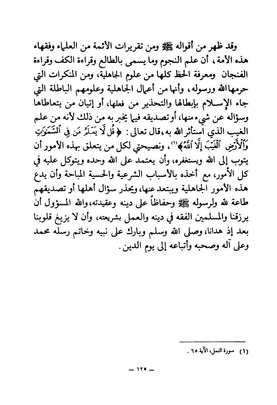 وقد ظهر من أقواله صلى الله عليه وسلم ومن تقريرات الأئمة من العلماء وفقهاء هذه الأمة، أن علم النجوم وما يسمى بالطالع وقراءة الكف وقراءة الفنجان ومعرفة الحظ كلها من علوم الجاهلية، ومن المنكرات التي حرمها الله ورسوله، وأنها من أعمال الجاهلية وعلومهم الباطلة التي جاء الإسلام بإبطالها والتحذير من فعلها، أو إتيان من يتعاطاها وسؤاله عن شيء منها، أو تصديقه فيما يخبر به من ذلك لأنه من علم الغيب الذي استأثر الله به، قال تعالى: {قُلْ لَا يَعْلَمُ مَنْ فِي السَّمَاوَاتِ وَالْأَرْضِ الْغَيْبَ إِلَّا اللَّهُ} (¬1) ونصيحتي لكل من يتعلق بهذه الأمور أن يتوب إلى الله ويستغفره، وأن يعتمد على الله وحده ويتوكل عليه في كل الأمور، مع أخذه بالأسباب الشرعية والحسية المباحة وأن يدع هذه الأمور الجاهلية ويبتعد عنها، ويحذر سؤال أهلها أو تصديقهم طاعة لله ولرسوله صلى الله عليه وسلم وحفاظا على دينه وعقيدته، والله المسئول أن يرزقنا والمسلمين الفقه في دينه والعمل بشريعته، وأن لا يزيغ قلوبنا بعد إذ هدانا، وصلى الله وسلم وبارك على نبيه وخاتم رسله محمد وعلى آله وصحبه وأتباعه إلى يوم الدين.