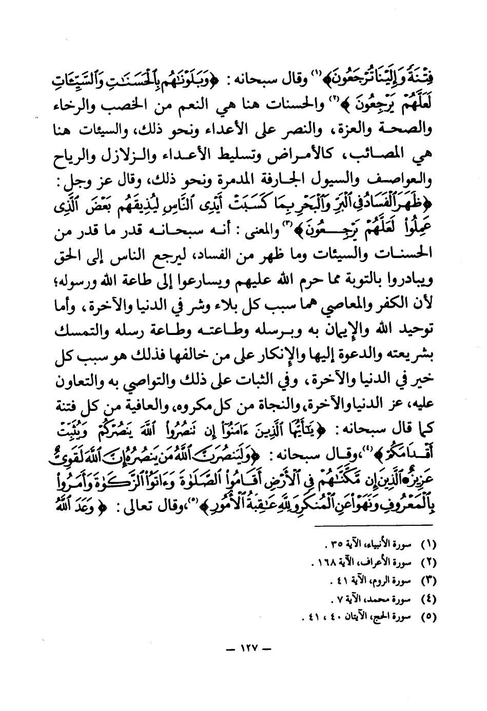 وقال سبحانه: {وَبَلَوْنَاهُمْ بِالْحَسَنَاتِ وَالسَّيِّئَاتِ لَعَلَّهُمْ يَرْجِعُونَ} (¬1) والحسنات هنا هي النعم من الخصب والرخاء والصحة والعزة، والنصر على الأعداء ونحو ذلك، والسيئات هنا هي المصائب، كالأمراض وتسليط الأعداء والزلازل والرياح والعواصف والسيول الجارفة المدمرة ونحو ذلك، وقال عز وجل: {ظَهَرَ الْفَسَادُ فِي الْبَرِّ وَالْبَحْرِ بِمَا كَسَبَتْ أَيْدِي النَّاسِ لِيُذِيقَهُمْ بَعْضَ الَّذِي عَمِلُوا لَعَلَّهُمْ يَرْجِعُونَ} (¬2) والمعنى: أنه سبحانه قدر ما قدر من الحسنات والسيئات وما ظهر من الفساد، ليرجع الناس إلى الحق ويبادروا بالتوبة مما حرم الله عليهم ويسارعوا إلى طاعة الله ورسوله؛ لأن الكفر والمعاصي هما سبب كل بلاء وشر في الدنيا والآخرة، وأما توحيد الله والإيمان به وبرسله وطاعته وطاعة رسله والتمسك بشريعته والدعوة إليها والإنكار على من خالفها فذلك هو سبب كل خير في الدنيا والآخرة، وفي الثبات على ذلك والتواصي به والتعاون عليه، عز الدنيا والآخرة، والنجاة من كل مكروه، والعافية من كل فتنة كما قال سبحانه: {يَا أَيُّهَا الَّذِينَ آمَنُوا إِنْ تَنْصُرُوا اللَّهَ يَنْصُرْكُمْ وَيُثَبِّتْ أَقْدَامَكُمْ} (¬3) وقال سبحانه: {وَلَيَنْصُرَنَّ اللَّهُ مَنْ يَنْصُرُهُ إِنَّ اللَّهَ لَقَوِيٌّ عَزِيزٌ} (¬4) {الَّذِينَ إِنْ مَكَّنَّاهُمْ فِي الْأَرْضِ أَقَامُوا الصَّلَاةَ وَآتَوُا الزَّكَاةَ وَأَمَرُوا بِالْمَعْرُوفِ وَنَهَوْا عَنِ الْمُنْكَرِ وَلِلَّهِ عَاقِبَةُ الْأُمُورِ} (¬5) وقال تعالى: