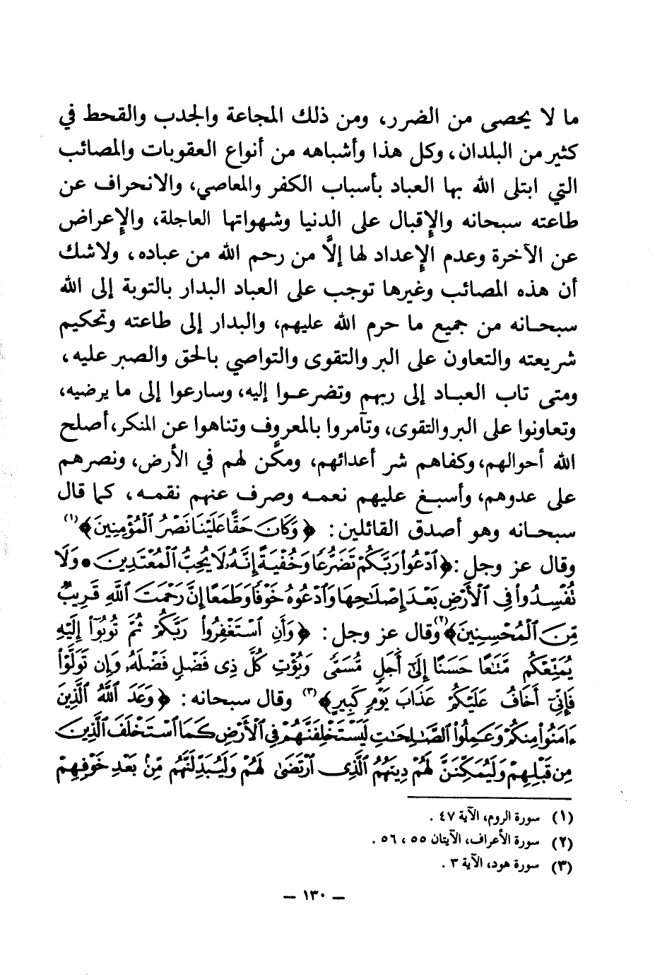 ما لا يحصى من الضرر، ومن ذلك المجاعة والجدب والقحط في كثير من البلدان، وكل هذا وأشباهه من أنواع العقوبات والمصائب التي ابتلى الله بها العباد بأسباب الكفر والمعاصي، والانحراف عن طاعته سبحانه والإقبال على الدنيا وشهواتها العاجلة، والإعراض عن الآخرة وعدم الإعداد لها إلا من رحم الله من عبادة، ولا شك أن هذه المصائب وغيرها توجب على العباد البدار بالتوبة إلى الله سبحانه من جميع ما حرم الله عليهم، والبدار إلى طاعته وتحكيم شريعته والتعاون على البر والتقوى والتواصي بالحق والصبر عليه، ومتى تاب العباد إلى ربهم وتضرعوا إليه، وسارعوا إلى ما يرضيه، {وَتَعَاوَنُوا عَلَى الْبِرِّ وَالتَّقْوَى} (¬1) وتآمروا بالمعروف وتناهوا عن المنكر، أصلح الله أحوالهم، وكفاهم شر أعدائهم، ومكن لهم في الأرض، ونصرهم على عدوهم، وأسبغ عليهم نعمه وصرف عنهم نقمه، كما قال سبحانه وهو أصدق القائلين: {وَكَانَ حَقًّا عَلَيْنَا نَصْرُ الْمُؤْمِنِينَ} (¬2) وقال عز وجل: {ادْعُوا رَبَّكُمْ تَضَرُّعًا وَخُفْيَةً إِنَّهُ لَا يُحِبُّ الْمُعْتَدِينَ} (¬3) {وَلَا تُفْسِدُوا فِي الْأَرْضِ بَعْدَ إِصْلَاحِهَا وَادْعُوهُ خَوْفًا وَطَمَعًا إِنَّ رَحْمَتَ اللَّهِ قَرِيبٌ مِنَ الْمُحْسِنِينَ} (¬4) وقال عز وجل: {وَأَنِ اسْتَغْفِرُوا رَبَّكُمْ ثُمَّ تُوبُوا إِلَيْهِ يُمَتِّعْكُمْ مَتَاعًا حَسَنًا إِلَى أَجَلٍ مُسَمًّى وَيُؤْتِ كُلَّ ذِي فَضْلٍ فَضْلَهُ وَإِنْ تَوَلَّوْا فَإِنِّي أَخَافُ عَلَيْكُمْ عَذَابَ يَوْمٍ كَبِيرٍ} (¬5) وقال سبحانه: