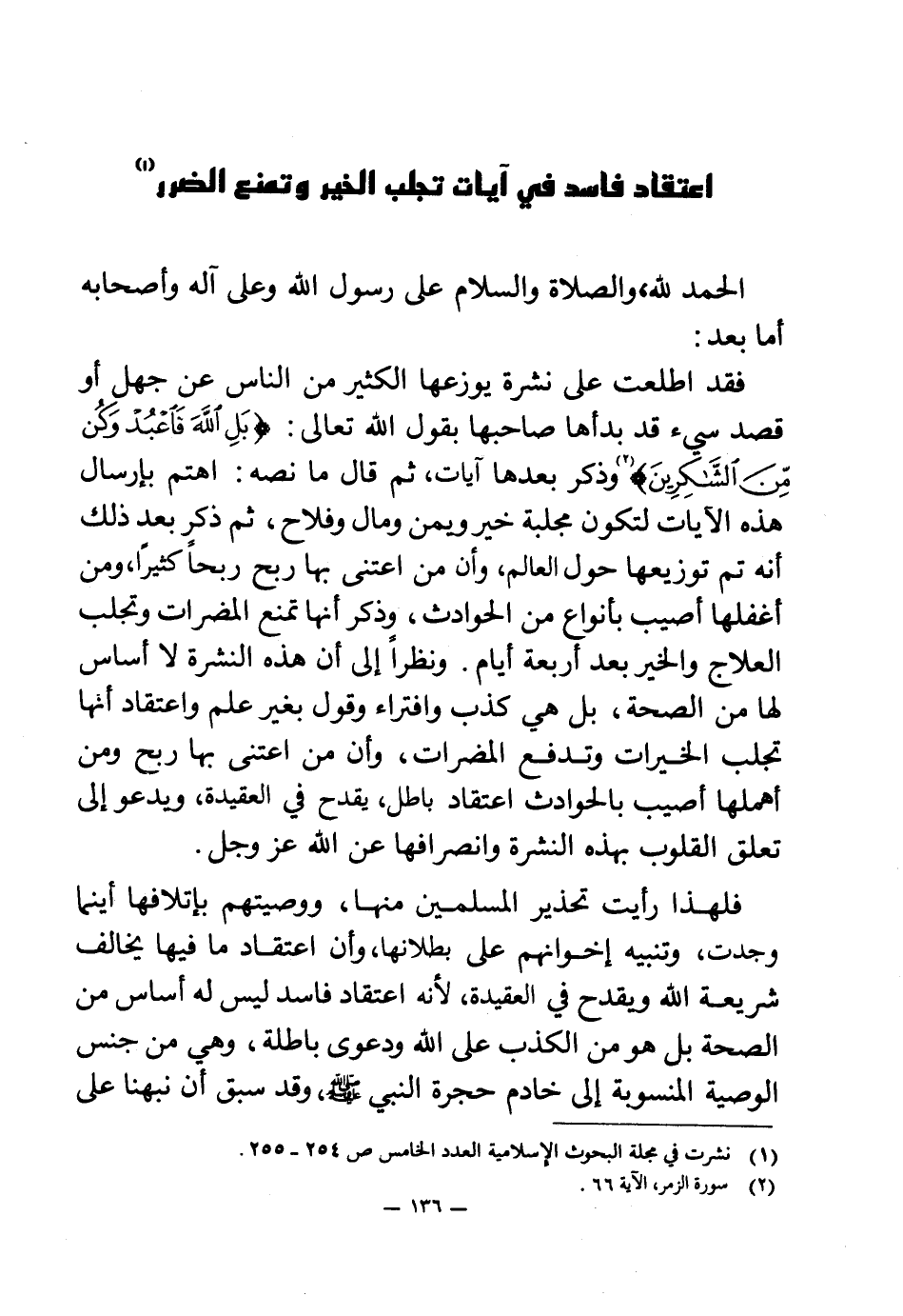 فقد اطلعت على نشرة يوزعها الكثير من الناس عن جهل أو قصد سيئ قد بدأها صاحبها بقول الله تعالى: {بَلِ اللَّهَ فَاعْبُدْ وَكُنْ مِنَ الشَّاكِرِينَ} (¬2) وذكر بعدها آيات، ثم قال ما نصه: اهتم بإرسال هذه الآيات لتكون مجلبة خير ويمن ومال وفلاح، ثم ذكر بعد ذلك أنه تم توزيعها حول العالم، وأن من اعتنى بها ربح ربحا كثيرا، ومن أغفلها أصيب بأنواع من الحوادث، وذكر أنها تمنع المضرات وتجلب العلاج والخير بعد أربعة أيام. ونظرا إلى أن هذه النشرة لا أساس لها من الصحة، بل هي كذب وافتراء وقول بغير علم واعتقاد أنها تجلب الخيرات وتدفع المضرات، وأن من اعتنى بها ربح ومن أهملها أصيب بالحوادث اعتقاد باطل، يقدح في العقيدة، ويدعو إلى تعلق القلوب بهذه النشرة وانصرافها عن الله عز وجل.