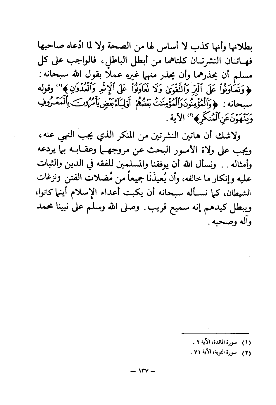 بطلانها وأنها كذب لا أساس لها من الصحة ولا لما ادعاه صاحبها فهاتان النشرتان كلتاهما من أبطل الباطل، فالواجب على كل مسلم أن يحذرهما وأن يحذر منهما غيره عملا بقول الله سبحانه: {وَتَعَاوَنُوا عَلَى الْبِرِّ وَالتَّقْوَى وَلَا تَعَاوَنُوا عَلَى الْإِثْمِ وَالْعُدْوَانِ} (¬1) وقوله سبحانه: {وَالْمُؤْمِنُونَ وَالْمُؤْمِنَاتُ بَعْضُهُمْ أَوْلِيَاءُ بَعْضٍ يَأْمُرُونَ بِالْمَعْرُوفِ وَيَنْهَوْنَ عَنِ الْمُنْكَرِ} (¬2) الآية.