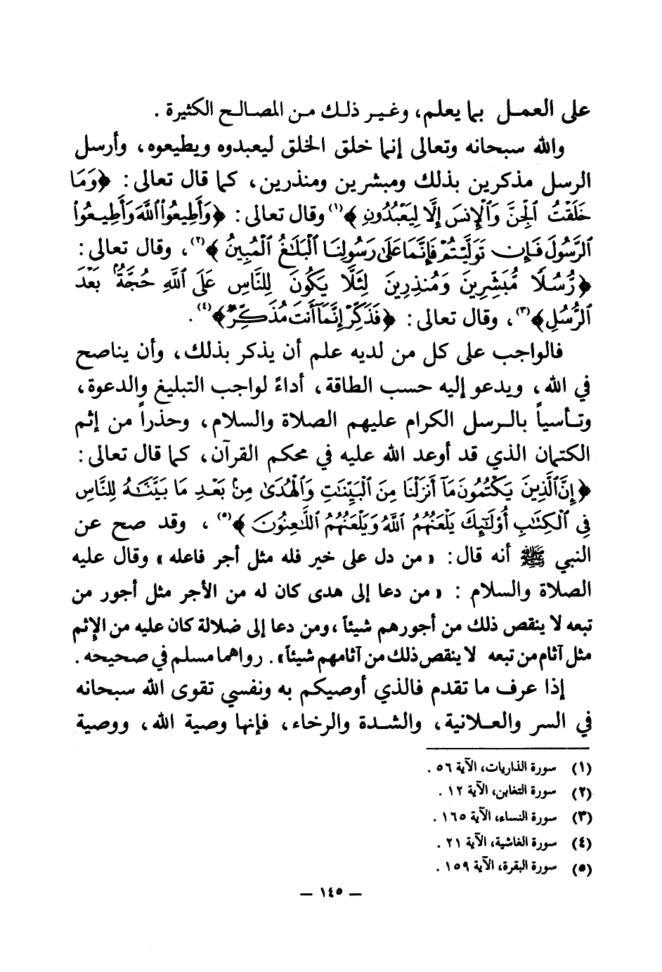 فالواجب على كل من لديه علم أن يذكر بذلك، وأن يناصح في الله، ويدعو إليه حسب الطاقة، أداء لواجب التبليغ والدعوة، وتأسيا بالرسل الكرام عليهم الصلاة والسلام، وحذرا من إثم الكتمان الذي قد أوعد الله عليه في محكم القرآن، كما قال تعالى: {إِنَّ الَّذِينَ يَكْتُمُونَ مَا أَنْزَلْنَا مِنَ الْبَيِّنَاتِ وَالْهُدَى مِنْ بَعْدِ مَا بَيَّنَّاهُ لِلنَّاسِ فِي الْكِتَابِ أُولَئِكَ يَلْعَنُهُمُ اللَّهُ وَيَلْعَنُهُمُ اللَّاعِنُونَ} (¬5) وقد صح عن النبي صلى الله عليه وسلم أنه قال: «من دل على خير فله مثل أجر فاعله (¬6) » وقال عليه الصلاة والسلام: «من دعا إلى هدى كان له من الأجر مثل أجور من تبعه لا ينقص ذلك من أجورهم شيئا، ومن دعا إلى ضلالة كان عليه من الإثم مثل آثام من تبعه لا ينقص ذلك من آثامهم شيئا (¬7) » . رواهما مسلم في صحيحه.