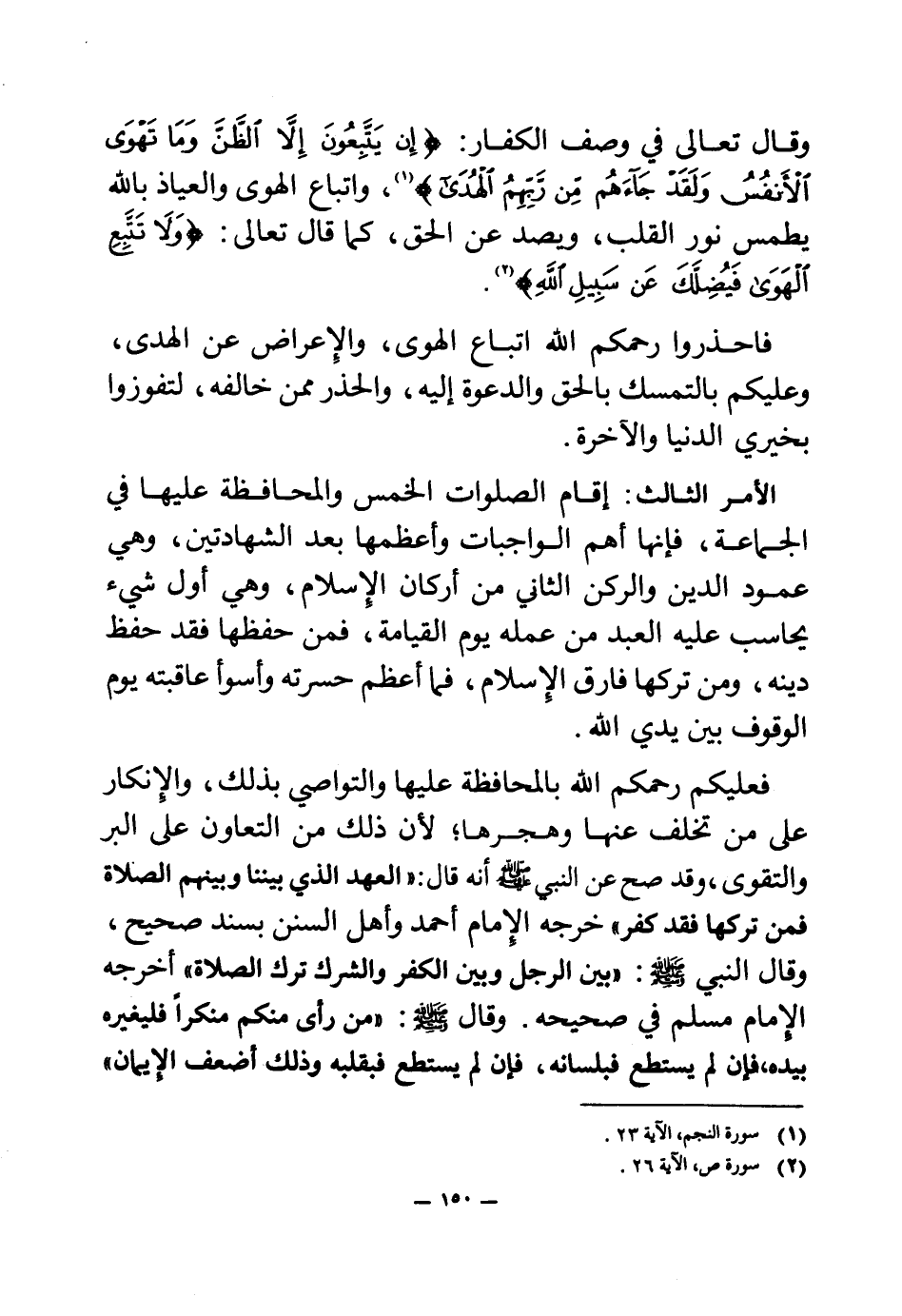 وقال تعالى في وصف الكفار: {إِنْ يَتَّبِعُونَ إِلَّا الظَّنَّ وَمَا تَهْوَى الْأَنْفُسُ وَلَقَدْ جَاءَهُمْ مِنْ رَبِّهِمُ الْهُدَى} (¬1) واتباع الهوى والعياذ بالله يطمس نور القلب، ويصد عن الحق، كما قال تعالى: ولا تتبع الهوى فيضلك عن سبيل الله. فاحذروا رحمكم الله اتباع الهوى، والإعراض عن الهدى، وعليكم بالتمسك بالحق والدعوة إليه، والحذر ممن خالفه، لتفوزوا بخيري الدنيا والآخرة.