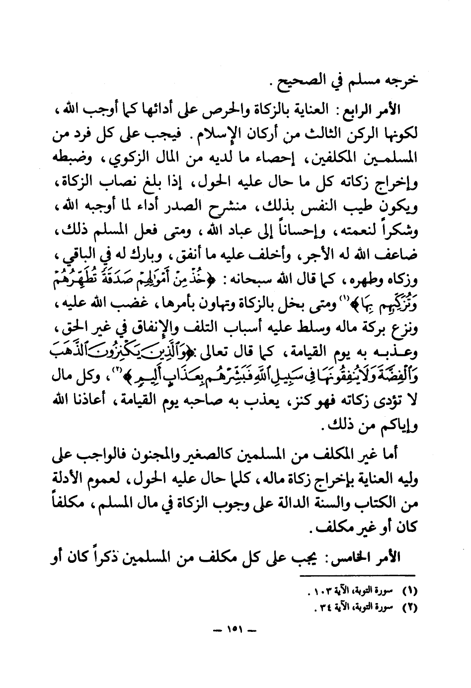 الأمر الرابع: العناية بالزكاة والحرص على أدائها كما أوجب الله، لكونها الركن الثالث من أركان الإسلام. فيجب على كل فرد من المسلمين المكلفين، إحصاء ما لديه من المال الزكوي، وضبطه وإخراج زكاته كل ما حال عليه الحول، إذا بلغ نصاب الزكاة، ويكون طيب النفس بذلك، منشرح الصدر أداء لما أوجبه الله، وشكرا لنعمته، وإحسانا إلى عباد الله، ومتى فعل المسلم ذلك، ضاعف الله له الأجر، وأخلف عليه ما أنفق، وبارك له في الباقي، وزكاه وطهره، كما قال الله سبحانه: {خُذْ مِنْ أَمْوَالِهِمْ صَدَقَةً تُطَهِّرُهُمْ وَتُزَكِّيهِمْ بِهَا} (¬1) ومتى بخل بالزكاة وتهاون بأمرها، غضب الله عليه، ونزع بركة ماله وسلط عليه أسباب التلف والإنفاق في غير الحق، وعذبه به يوم القيامة، كما قال تعالى: {وَالَّذِينَ يَكْنِزُونَ الذَّهَبَ وَالْفِضَّةَ وَلَا يُنْفِقُونَهَا فِي سَبِيلِ اللَّهِ فَبَشِّرْهُمْ بِعَذَابٍ أَلِيمٍ} (¬2) وكل مال لا تؤدى زكاته فهو كنز، يعذب به صاحبه يوم القيامة، أعاذنا الله وإياكم من ذلك.