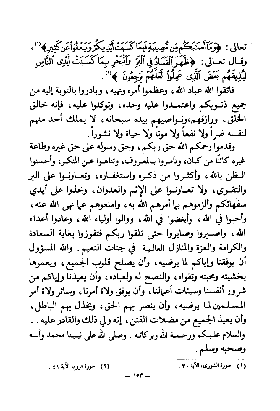 وقدموا رحمكم الله حق ربكم، وحق رسوله على حق غيره وطاعة غيره كائنا من كان، وتآمروا بالمعروف، وتناهوا عن المنكر، وأحسنوا الظن بالله، وأكثروا من ذكره واستغفاره، وتعاونوا على البر والتقوى، ولا تعاونوا على الإثم والعدوان، وخذوا على أيدي سفهائكم وألزموهم بما أمرهم الله به، وامنعوهم عما نهى الله عنه، وأحبوا في الله، وأبغضوا في الله، ووالوا أولياء الله، وعادوا أعداء الله، واصبروا وصابروا حتى تلقوا ربكم فتفوزوا بغاية السعادة والكرامة والعزة والمنازل العالية في جنات النعيم.