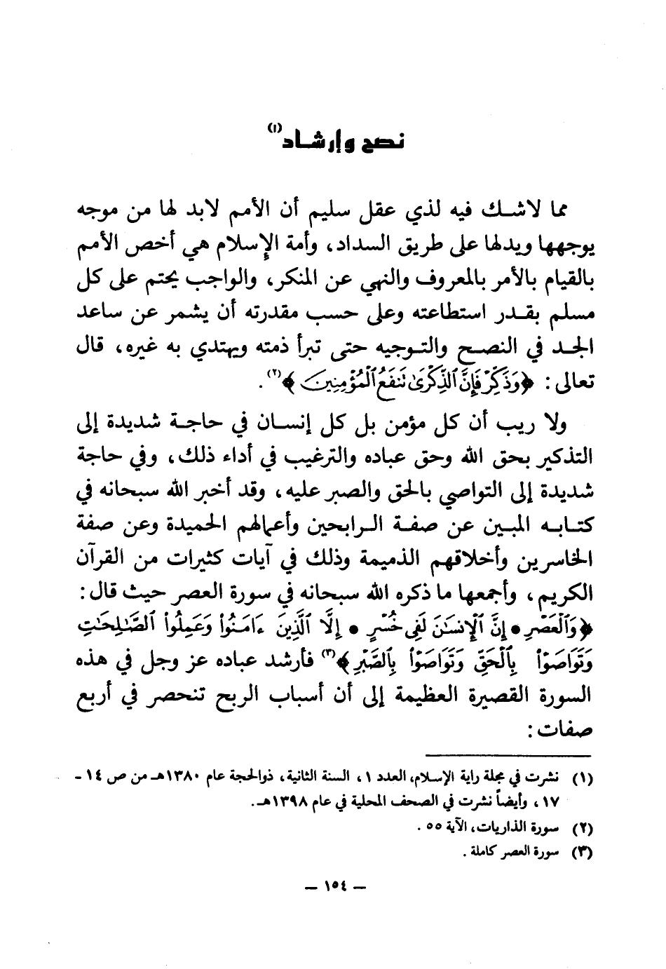 مما لا شك فيه لذي عقل سليم أن الأمم لا بد لها من موجه يوجهها ويدلها على طريق السداد، وأمة الإسلام هي أخص الأمم بالقيام بالأمر بالمعروف والنهي عن المنكر، والواجب يحتم على كل مسلم بقدر استطاعته وعلى حسب مقدرته أن يشمر عن ساعد الجد في النصح والتوجيه حتى تبرأ ذمته ويهتدي به غيره، قال تعالى: {وَذَكِّرْ فَإِنَّ الذِّكْرَى تَنْفَعُ الْمُؤْمِنِينَ} (¬1)