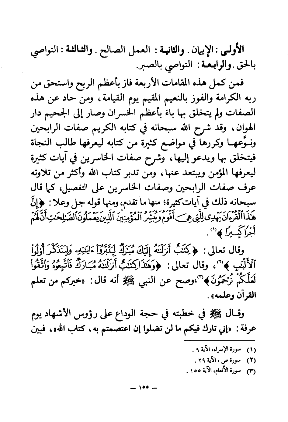 فمن كمل هذه المقامات الأربعة فاز بأعظم الربح واستحق من ربه الكرامة والفوز بالنعيم المقيم يوم القيامة، ومن حاد عن هذه الصفات ولم يتخلق بها باء بأعظم الخسران وصار إلى الجحيم دار الهوان، وقد شرح الله سبحانه في كتابه الكريم صفات الرابحين ونوعها وكررها في مواضع كثيرة من كتابه ليعرفها طالب النجاة فيتخلق بها ويدعو إليها، وشرح صفات الخاسرين في آيات كثيرة ليعرفها المؤمن ويبتعد عنها، ومن تدبر كتاب الله وأكثر من تلاوته عرف صفات الرابحين وصفات الخاسرين على التفصيل، كما قال سبحانه ذلك في آيات كثيرة؛ منها ما تقدم، ومنها قوله جل وعلا: {إِنَّ هَذَا الْقُرْآنَ يَهْدِي لِلَّتِي هِيَ أَقْوَمُ وَيُبَشِّرُ الْمُؤْمِنِينَ الَّذِينَ يَعْمَلُونَ الصَّالِحَاتِ أَنَّ لَهُمْ أَجْرًا كَبِيرًا} (¬1) وقال تعالى: {كِتَابٌ أَنْزَلْنَاهُ إِلَيْكَ مُبَارَكٌ لِيَدَّبَّرُوا آيَاتِهِ وَلِيَتَذَكَّرَ أُولُو الْأَلْبَابِ} (¬2) وقال تعالى: {وَهَذَا كِتَابٌ أَنْزَلْنَاهُ مُبَارَكٌ فَاتَّبِعُوهُ وَاتَّقُوا لَعَلَّكُمْ تُرْحَمُونَ} (¬3) وصح عن النبي صلى الله عليه وسلم أنه قال: «خيركم من تعلم القرآن وعلمه (¬4) »