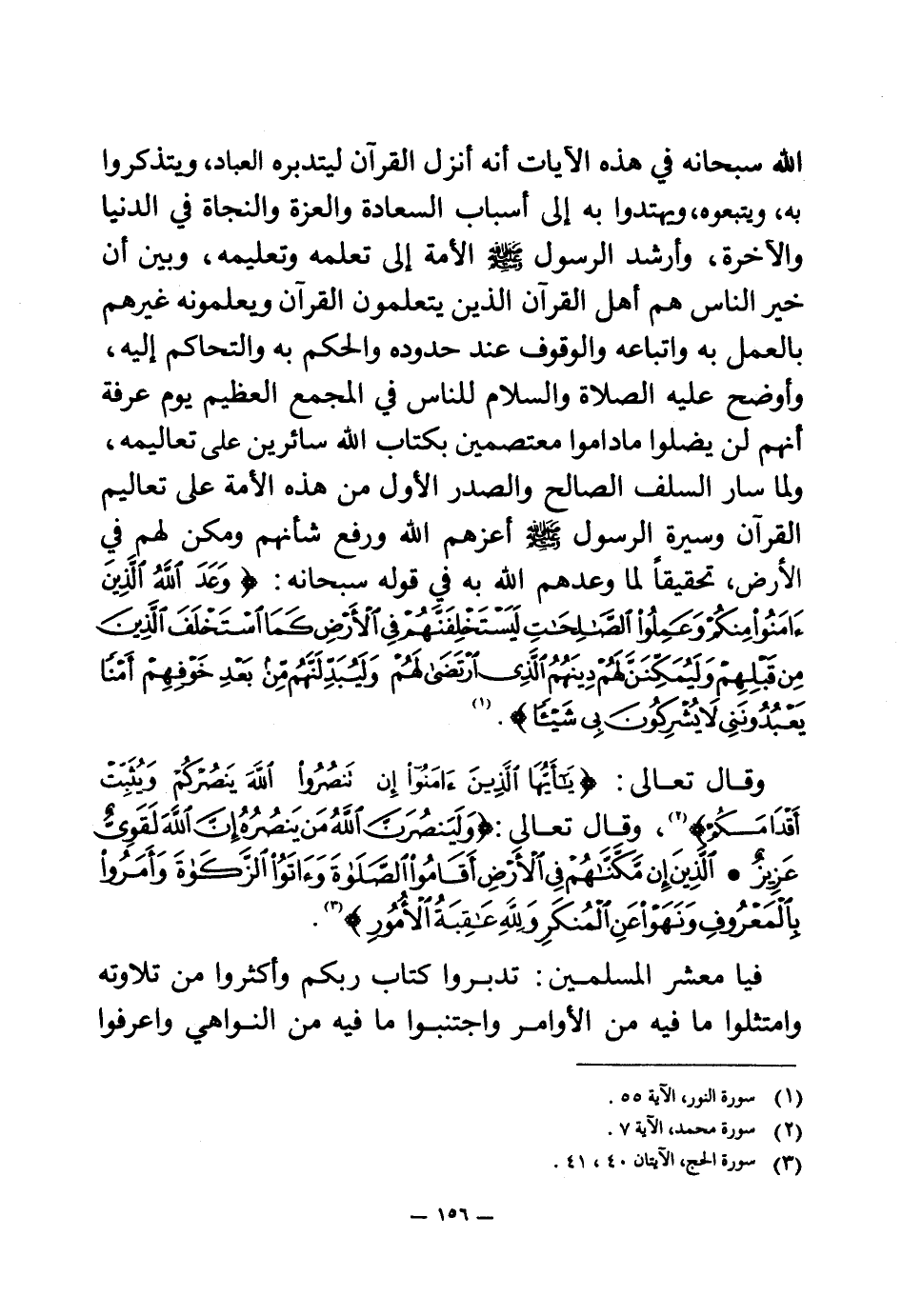 الله سبحانه في هذه الآيات أنه أنزل القرآن ليتدبره العباد، ويتذكروا به، ويتبعوه، ويهتدوا به إلى أسباب السعادة والعزة والنجاة في الدنيا والآخرة، وأرشد الرسول صلى الله عليه وسلم الأمة إلى تعلمه وتعليمه، وبين أن خير الناس هم أهل القرآن الذين يتعلمون القرآن ويعلمونه غيرهم بالعمل به واتباعه والوقوف عند حدوده والحكم به والتحاكم إليه، وأوضح عليه الصلاة والسلام للناس في المجمع العظيم يوم عرفة أنهم لن يضلوا ما داموا معتصمين بكتاب الله سائرين على تعاليمه، ولما سار السلف الصالح والصدر الأول من هذه الأمة على تعاليم القرآن وسيرة الرسول صلى الله عليه وسلم أعزهم الله ورفع شأنهم ومكن لهم في الأرض، تحقيقا لما وعدهم الله به في قوله سبحانه: {وَعَدَ اللَّهُ الَّذِينَ آمَنُوا مِنْكُمْ وَعَمِلُوا الصَّالِحَاتِ لَيَسْتَخْلِفَنَّهُمْ فِي الْأَرْضِ كَمَا اسْتَخْلَفَ الَّذِينَ مِنْ قَبْلِهِمْ وَلَيُمَكِّنَنَّ لَهُمْ دِينَهُمُ الَّذِي ارْتَضَى لَهُمْ وَلَيُبَدِّلَنَّهُمْ مِنْ بَعْدِ خَوْفِهِمْ أَمْنًا يَعْبُدُونَنِي لَا يُشْرِكُونَ بِي شَيْئًا} (¬1) وقال تعالى: {يَا أَيُّهَا الَّذِينَ آمَنُوا إِنْ تَنْصُرُوا اللَّهَ يَنْصُرْكُمْ وَيُثَبِّتْ أَقْدَامَكُمْ} (¬2) وقال تعالى: {وَلَيَنْصُرَنَّ اللَّهُ مَنْ يَنْصُرُهُ إِنَّ اللَّهَ لَقَوِيٌّ عَزِيزٌ} (¬3) {الَّذِينَ إِنْ مَكَّنَّاهُمْ فِي الْأَرْضِ أَقَامُوا الصَّلَاةَ وَآتَوُا الزَّكَاةَ وَأَمَرُوا بِالْمَعْرُوفِ وَنَهَوْا عَنِ الْمُنْكَرِ وَلِلَّهِ عَاقِبَةُ الْأُمُورِ} (¬4)
