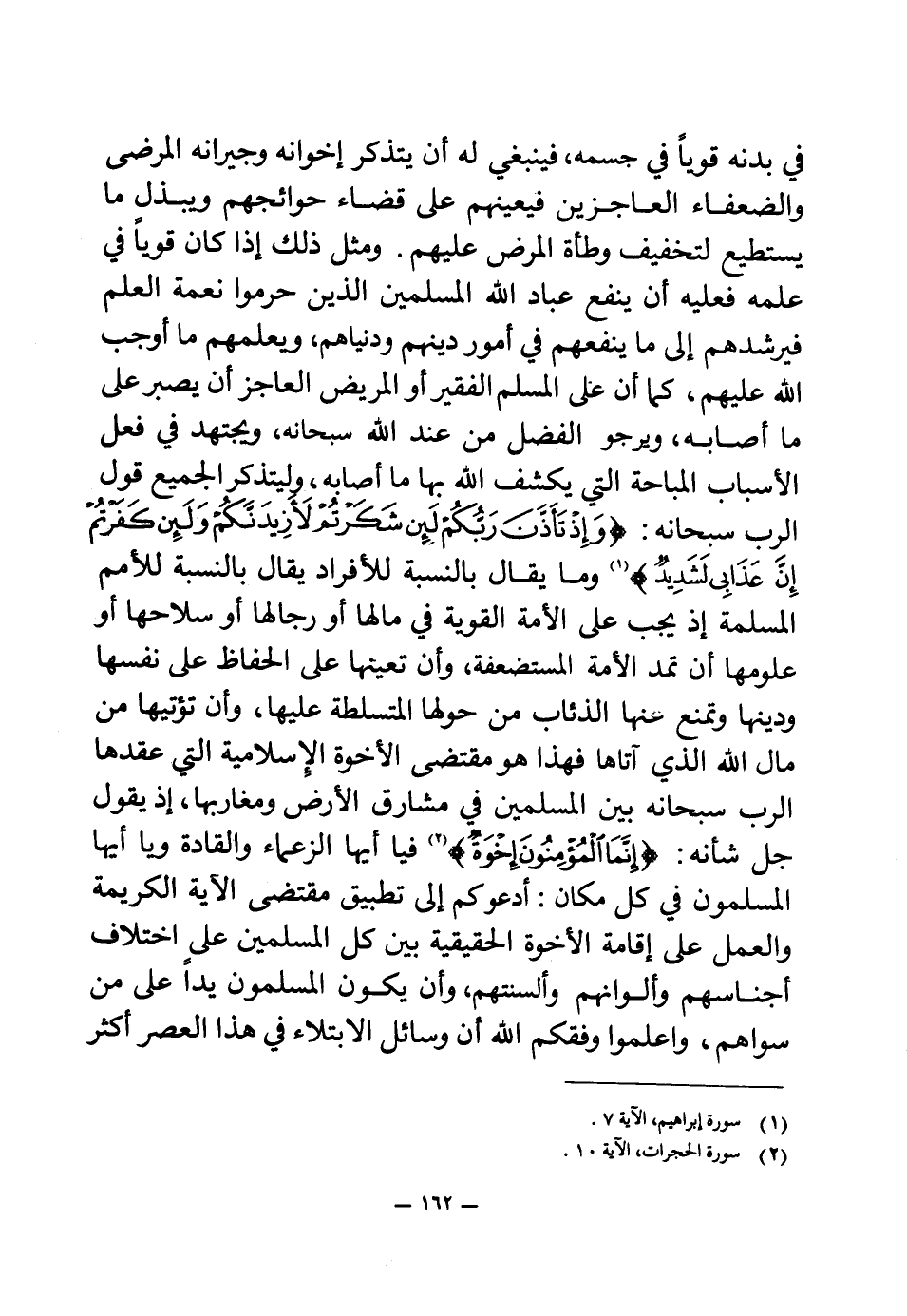 ومثل ذلك إذا كان قويا في علمه فعليه أن ينفع عباد الله المسلمين الذين حرموا نعمة العلم فيرشدهم إلى ما ينفعهم في أمور دينهم ودنياهم، ويعلمهم ما أوجب الله عليهم، كما أن على المسلم الفقير أو المريض العاجز أن يصبر على ما أصابه، ويرجو الفضل من عند الله سبحانه، ويجتهد في فعل الأسباب المباحة التي يكشف الله بها ما أصابه، وليتذكر الجميع قول الرب سبحانه: {وَإِذْ تَأَذَّنَ رَبُّكُمْ لَئِنْ شَكَرْتُمْ لَأَزِيدَنَّكُمْ وَلَئِنْ كَفَرْتُمْ إِنَّ عَذَابِي لَشَدِيدٌ} (¬1) وما يقال بالنسبة للأفراد يقال بالنسبة للأمم المسلمة إذ يجب على الأمة القوية في مالها أو رجالها أو سلاحها أو علومها أن تمد الأمة المستضعفة، وأن تعينها على الحفاظ على نفسها ودينها وتمنع عنها الذئاب من حولها المتسلطة عليها، - وأن تؤتيها من مال الله الذي آتاها فهذا هو مقتضى الأخوة الإسلامية التي عقدها الرب سبحانه بين المسلمين في مشارق الأرض ومغاربها، إذ يقول جل شأنه: {إِنَّمَا الْمُؤْمِنُونَ إِخْوَةٌ} (¬2) فيا أيها الزعماء والقادة ويا أيها المسلمون في كل مكان: أدعوكم إلى تطبيق مقتضى الآية الكريمة والعمل على إقامة الأخوة الحقيقية بين كل المسلمين على اختلاف أجناسهم وألوانهم وألسنتهم، وأن يكون المسلمون يدا على من سواهم، واعلموا وفقكم الله أن وسائل الابتلاء في هذا العصر أكثر