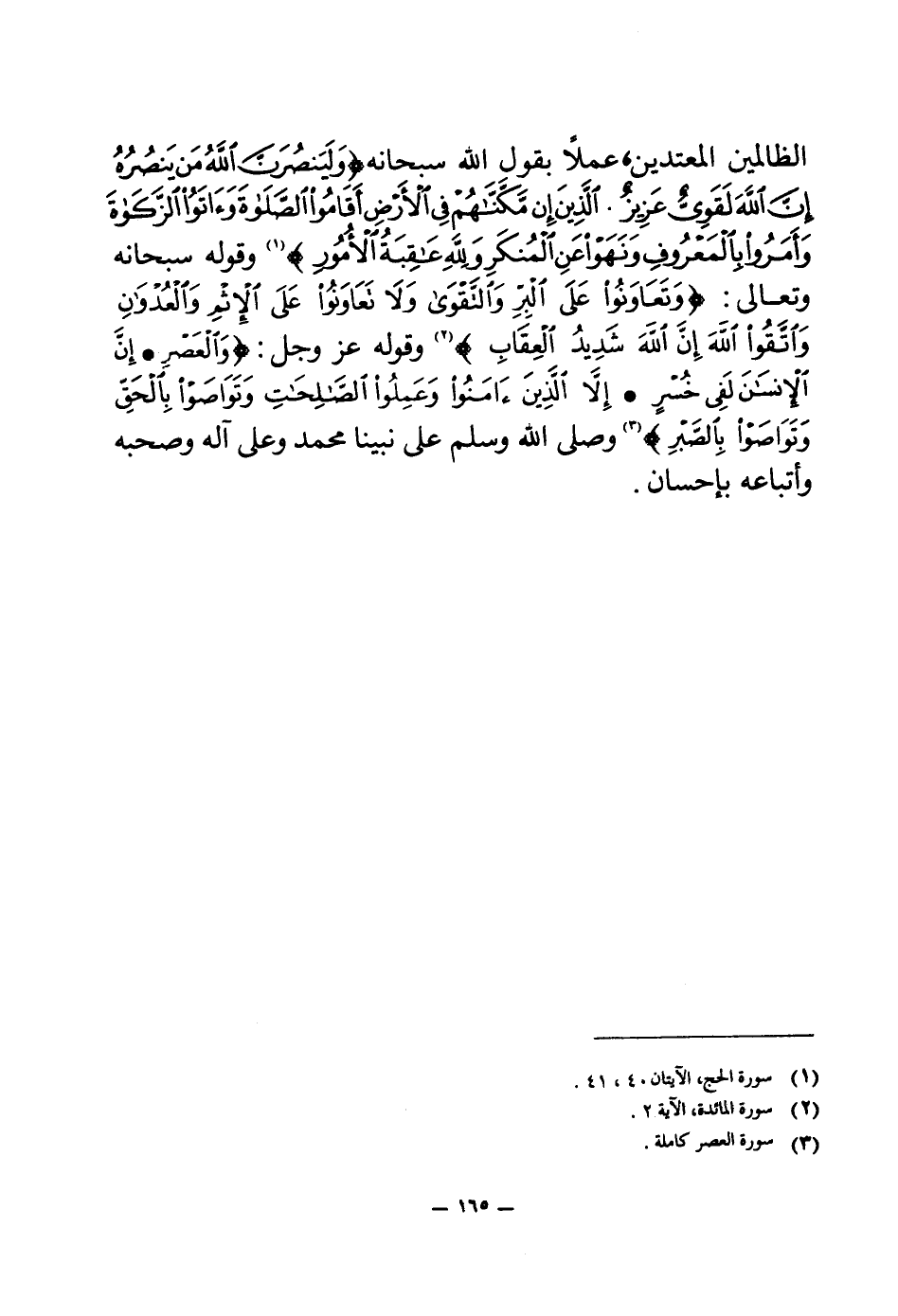 الظالمين المعتدين، عملا بقول الله سبحانه {وَلَيَنْصُرَنَّ اللَّهُ مَنْ يَنْصُرُهُ إِنَّ اللَّهَ لَقَوِيٌّ عَزِيزٌ} (¬1) {الَّذِينَ إِنْ مَكَّنَّاهُمْ فِي الْأَرْضِ أَقَامُوا الصَّلَاةَ وَآتَوُا الزَّكَاةَ وَأَمَرُوا بِالْمَعْرُوفِ وَنَهَوْا عَنِ الْمُنْكَرِ وَلِلَّهِ عَاقِبَةُ الْأُمُورِ} (¬2) وقوله سبحانه وتعالى: {وَتَعَاوَنُوا عَلَى الْبِرِّ وَالتَّقْوَى وَلَا تَعَاوَنُوا عَلَى الْإِثْمِ وَالْعُدْوَانِ وَاتَّقُوا اللَّهَ إِنَّ اللَّهَ شَدِيدُ الْعِقَابِ} (¬3) وقوله عز وجل: {وَالْعَصْرِ} (¬4) {إِنَّ الْإِنْسَانَ لَفِي خُسْرٍ} (¬5) {إِلَّا الَّذِينَ آمَنُوا وَعَمِلُوا الصَّالِحَاتِ وَتَوَاصَوْا بِالْحَقِّ وَتَوَاصَوْا بِالصَّبْرِ} (¬6) وصلى الله وسلم على نبينا محمد وعلى آله وصحبه وأتباعه بإحسان.