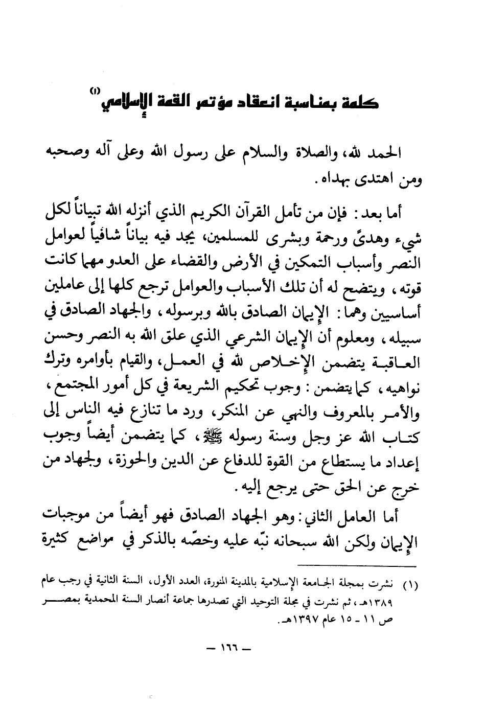 أما بعد: فإن من تأمل القرآن الكريم الذي أنزله الله تبيانا لكل شيء وهدى ورحمة وبشرى للمسلمين، يجد فيه بيانا شافيا لعوامل النصر وأسباب التمكين في الأرض والقضاء على العدو مهما كانت قوته، ويتضح له أن تلك الأسباب والعوامل ترجع كلها إلى عاملين أساسيين وهما: الإيمان الصادق بالله وبرسوله، والجهاد الصادق في سبيله، ومعلوم أن الإيمان الشرعي الذي علق الله به النصر وحسن العاقبة يتضمن الإخلاص لله في العمل، والقيام بأوامره وترك نواهيه، كما يتضمن: وجوب تحكيم الشريعة في كل أمور المجتمع، والأمر بالمعروف والنهي عن المنكر، ورد ما تنازع فيه الناس إلى كتاب الله عز وجل وسنة رسوله صلى الله عليه وسلم. كما يتضمن أيضا وجوب إعداد ما يستطاع من القوة للدفاع عن الدين والحوزة، ولجهاد من خرج عن الحق حتى يرجع إليه.
