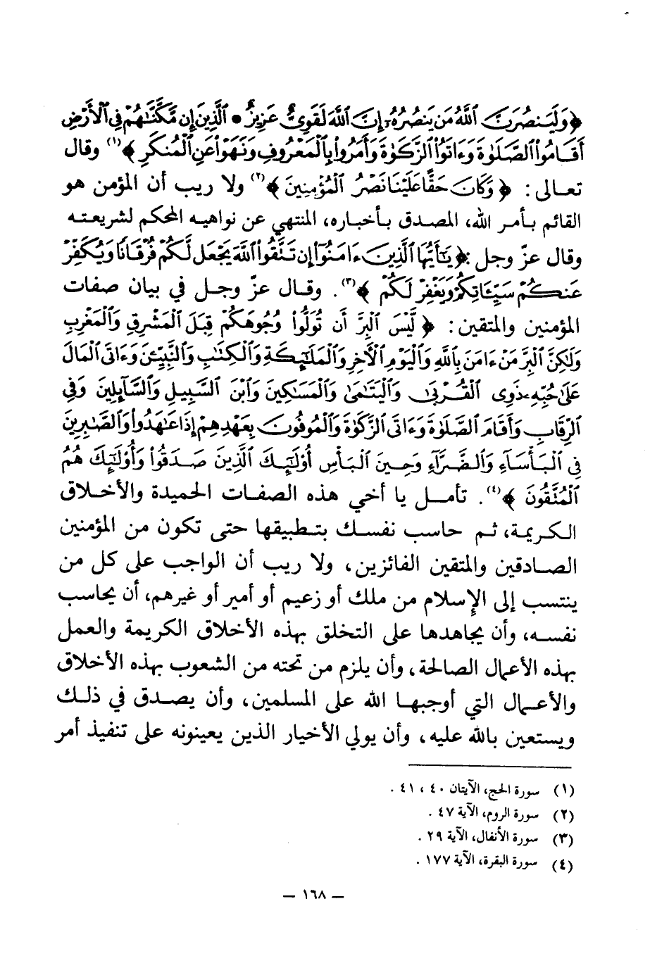 تأمل يا أخي هذه الصفات الحميدة والأخلاق الكريمة، ثم حاسب نفسك بتطبيقها حتى تكون من المؤمنين الصادقين والمتقين الفائزين، ولا ريب أن الواجب على كل من ينتسب إلى الإسلام من ملك أو زعيم أو أمير أو غيرهم، أن يحاسب نفسه، وأن يجاهدها على التخلق بهذه الأخلاق الكريمة والعمل بهذه الأعمال الصالحة، وأن يلزم من تحته من الشعوب بهذه الأخلاق والأعمال التي أوجبها الله على المسلمين، وأن يصدق في ذلك ويستعين بالله عليه، وأن يولي الأخيار الذين يعينونه على تنفيذ أمر