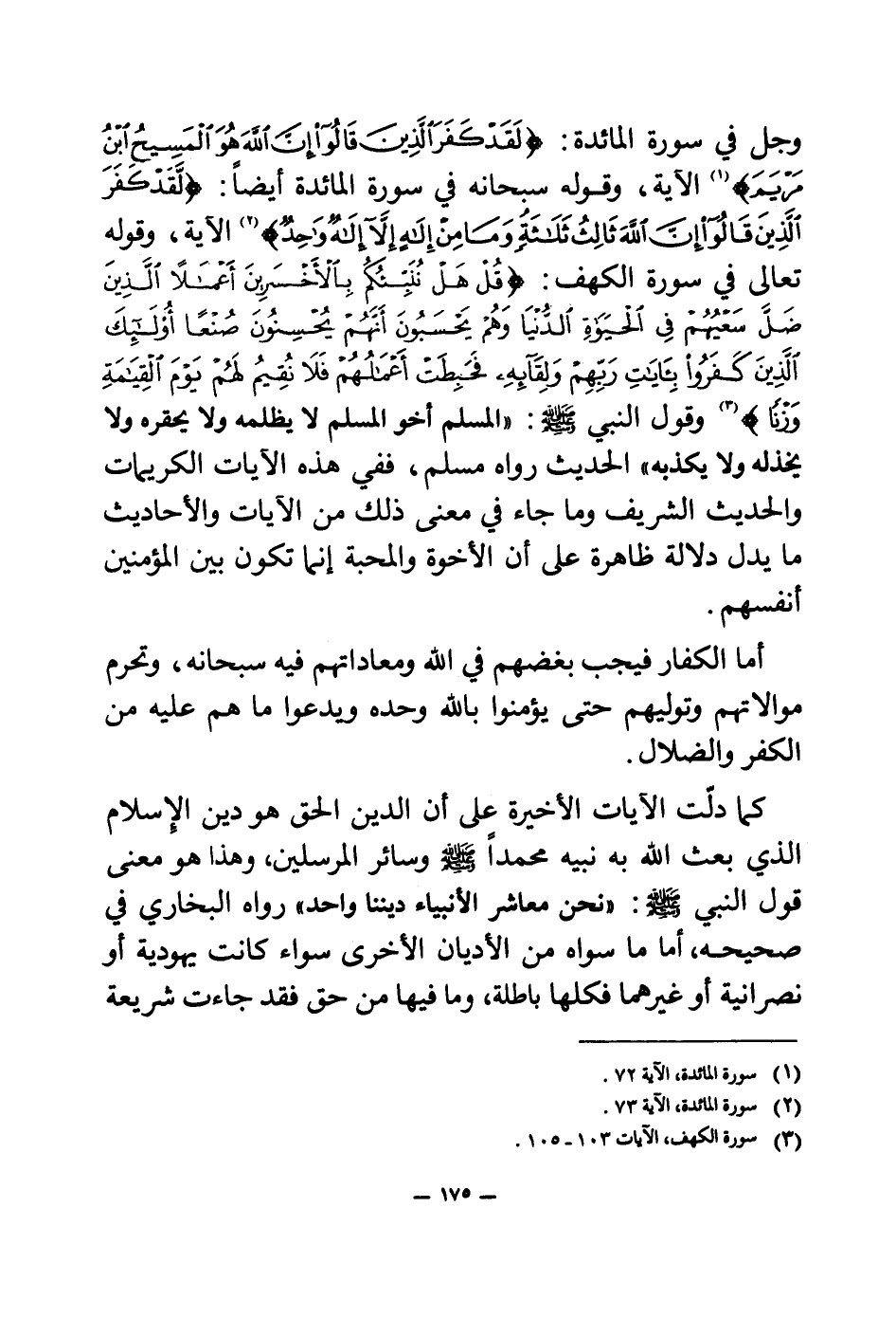 وجل في سورة المائدة: {لَقَدْ كَفَرَ الَّذِينَ قَالُوا إِنَّ اللَّهَ هُوَ الْمَسِيحُ ابْنُ مَرْيَمَ} (¬1) الآية، وقوله سبحانه في سورة المائدة أيضا: {لَقَدْ كَفَرَ الَّذِينَ قَالُوا إِنَّ اللَّهَ ثَالِثُ ثَلَاثَةٍ وَمَا مِنْ إِلَهٍ إِلَّا إِلَهٌ وَاحِدٌ} (¬2) الآية، وقوله تعالى في سورة الكهف: {قُلْ هَلْ نُنَبِّئُكُمْ بِالْأَخْسَرِينَ أَعْمَالًا} (¬3) {الَّذِينَ ضَلَّ سَعْيُهُمْ فِي الْحَيَاةِ الدُّنْيَا وَهُمْ يَحْسَبُونَ أَنَّهُمْ يُحْسِنُونَ صُنْعًا} (¬4) {أُولَئِكَ الَّذِينَ كَفَرُوا بِآيَاتِ رَبِّهِمْ وَلِقَائِهِ فَحَبِطَتْ أَعْمَالُهُمْ فَلَا نُقِيمُ لَهُمْ يَوْمَ الْقِيَامَةِ وَزْنًا} (¬5) وقول النبي صلى الله عليه وسلم: «المسلم أخو المسلم لا يظلمه ولا يحقره ولا يخذله ولا يكذبه (¬6) » الحديث رواه مسلم، ففي هذه الآيات الكريمات والحديث الشريف وما جاء في معنى ذلك من الآيات والأحاديث ما يدل دلالة ظاهرة على أن الأخوة والمحبة إنما تكون بين المؤمنين أنفسهم.