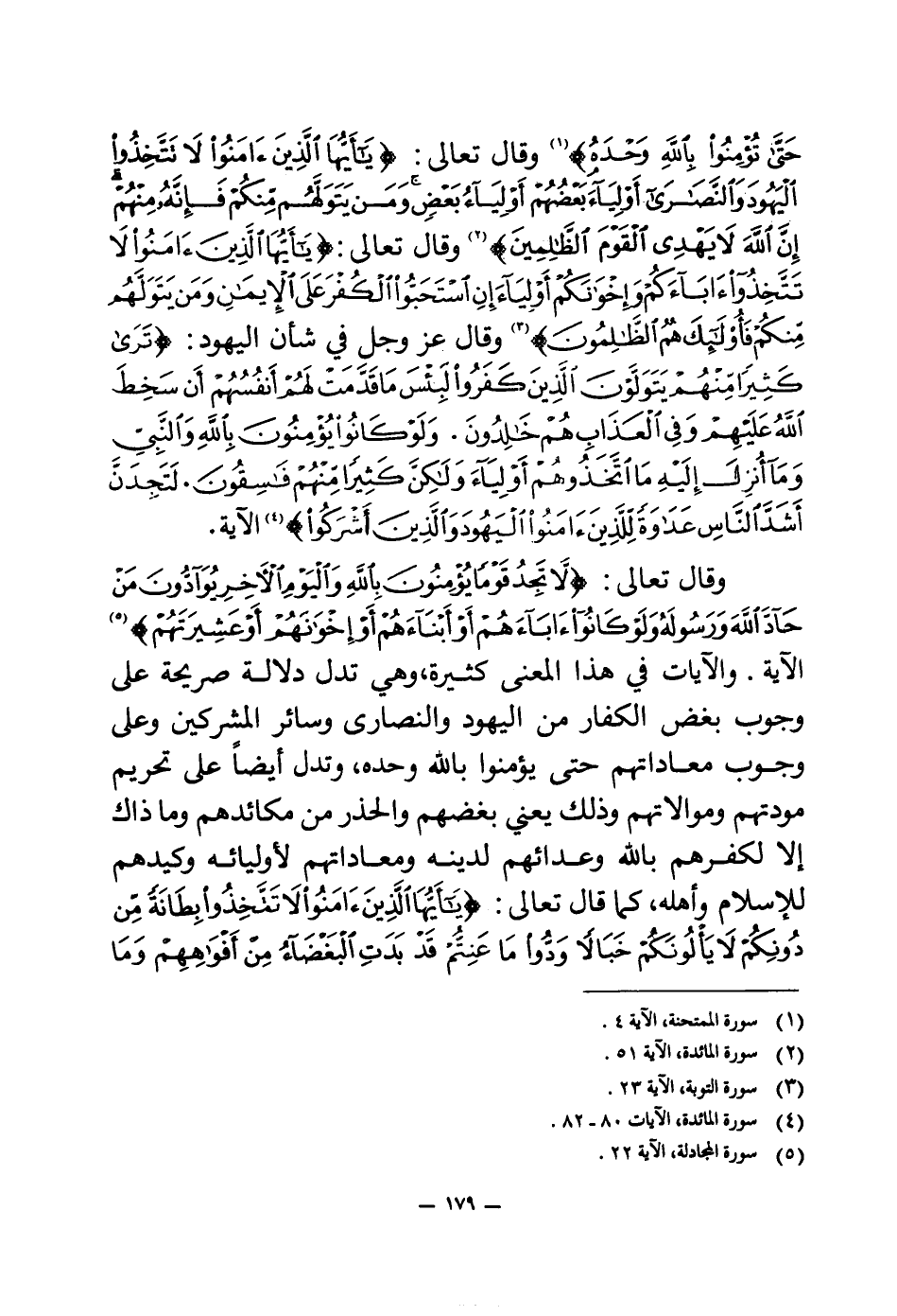 وقال تعالى {يَا أَيُّهَا الَّذِينَ آمَنُوا لَا تَتَّخِذُوا الْيَهُودَ وَالنَّصَارَى أَوْلِيَاءَ بَعْضُهُمْ أَوْلِيَاءُ بَعْضٍ وَمَنْ يَتَوَلَّهُمْ مِنْكُمْ فَإِنَّهُ مِنْهُمْ إِنَّ اللَّهَ لَا يَهْدِي الْقَوْمَ الظَّالِمِينَ} (¬1) وقال تعالى: {يَا أَيُّهَا الَّذِينَ آمَنُوا لَا تَتَّخِذُوا آبَاءَكُمْ وَإِخْوَانَكُمْ أَوْلِيَاءَ إِنِ اسْتَحَبُّوا الْكُفْرَ عَلَى الْإِيمَانِ وَمَنْ يَتَوَلَّهُمْ مِنْكُمْ فَأُولَئِكَ هُمُ الظَّالِمُونَ} (¬2) وقال عز وجل في شأن اليهود: {تَرَى كَثِيرًا مِنْهُمْ يَتَوَلَّوْنَ الَّذِينَ كَفَرُوا لَبِئْسَ مَا قَدَّمَتْ لَهُمْ أَنْفُسُهُمْ أَنْ سَخِطَ اللَّهُ عَلَيْهِمْ وَفِي الْعَذَابِ هُمْ خَالِدُونَ} (¬3) {وَلَوْ كَانُوا يُؤْمِنُونَ بِاللَّهِ وَالنَّبِيِّ وَمَا أُنْزِلَ إِلَيْهِ مَا اتَّخَذُوهُمْ أَوْلِيَاءَ وَلَكِنَّ كَثِيرًا مِنْهُمْ فَاسِقُونَ} (¬4) {لَتَجِدَنَّ أَشَدَّ النَّاسِ عَدَاوَةً لِلَّذِينَ آمَنُوا الْيَهُودَ وَالَّذِينَ أَشْرَكُوا} (¬5) الآية. وقال تعالى: {لَا تَجِدُ قَوْمًا يُؤْمِنُونَ بِاللَّهِ وَالْيَوْمِ الْآخِرِ يُوَادُّونَ مَنْ حَادَّ اللَّهَ وَرَسُولَهُ وَلَوْ كَانُوا آبَاءَهُمْ أَوْ أَبْنَاءَهُمْ أَوْ إِخْوَانَهُمْ أَوْ عَشِيرَتَهُمْ} (¬6) الآية.