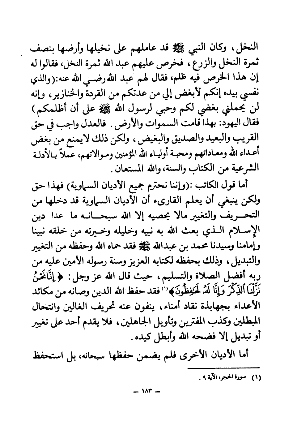 النخل، وكان النبي صلى الله عليه وسلم قد عاملهم على نخيلها وأرضها بنصف ثمرة النخل والزرع، فخرص عليهم عبد الله ثمرة النخل، فقالوا له إن هذا الخرص فيه ظلم، فقال لهم عبد الله رضي الله عنه: (والذي نفسي بيده إنكم لأبغض إلي من عدتكم من القردة والخنازير، وإنه لن يحملني بغضي لكم وحبي لرسول الله صلى الله عليه وسلم على أن أظلمكم) فقال اليهود: بهذا قامت السماوات والأرض. فالعدل واجب في حق القريب والبعيد والصديق والبغيض، ولكن ذلك لا يمنع من بغض أعداء الله ومعاداتهم ومحبة أولياء الله المؤمنين وموالاتهم، عملا بالأدلة الشرعية من الكتاب والسنة، والله المستعان. أما قول الكاتب: (وإننا نحترم جميع الأديان السماوية) فهذا حق ولكن ينبغي أن يعلم القارئ أن الأديان السماوية قد دخلها من التحريف والتغيير ما لا يحصيه إلا الله سبحانه ما عدا دين الإسلام الذي بعث الله به نبيه وخليله وخيرته من خلقه نبينا وإمامنا وسيدنا محمد بن عبد الله صلى الله عليه وسلم فقد حمله الله وحفظه من التغيير والتبديل، وذلك بحفظه لكتابه العزيز وسنة رسوله الأمين عليه من ربه أفضل الصلاة والتسليم، حيث قال الله عز وجل: {إِنَّا نَحْنُ نَزَّلْنَا الذِّكْرَ وَإِنَّا لَهُ لَحَافِظُونَ} (¬1) فقد حفظ الله الدين وصانه من مكائد الأعداء بجهابذة نقاد أمناء، ينفون عنه تحريف الغالين وانتحال المبطلين وكذب المفترين وتأويل الجاهلين، فلا يقدم أحد على تغيير أو تبديل إلا فضحه الله وأبطل كيده. أما الأديان الأخرى فلم يضمن حفظها سبحانه، بل استحفظ