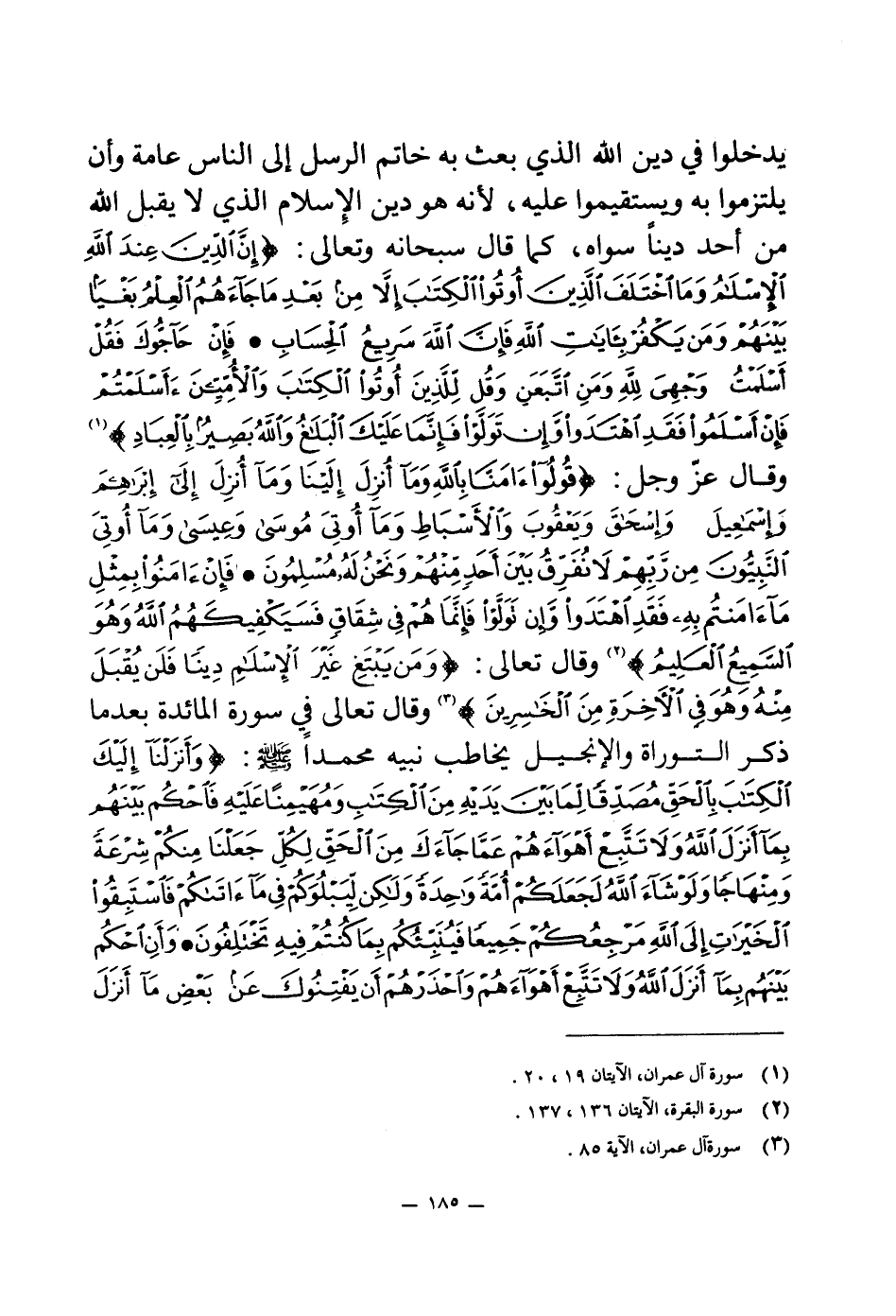 يدخلوا في دين الله الذي بعث به خاتم الرسل إلى الناس عامة وأن يلتزموا به ويستقيموا عليه، لأنه هو دين الإسلام الذي لا يقبل الله من أحد دينا سواه، كما قال سبحانه وتعالى: {إِنَّ الدِّينَ عِنْدَ اللَّهِ الْإِسْلَامُ وَمَا اخْتَلَفَ الَّذِينَ أُوتُوا الْكِتَابَ إِلَّا مِنْ بَعْدِ مَا جَاءَهُمُ الْعِلْمُ بَغْيًا بَيْنَهُمْ وَمَنْ يَكْفُرْ بِآيَاتِ اللَّهِ فَإِنَّ اللَّهَ سَرِيعُ الْحِسَابِ} (¬1) {فَإِنْ حَاجُّوكَ فَقُلْ أَسْلَمْتُ وَجْهِيَ لِلَّهِ وَمَنِ اتَّبَعَنِ وَقُلْ لِلَّذِينَ أُوتُوا الْكِتَابَ وَالْأُمِّيِّينَ أَأَسْلَمْتُمْ فَإِنْ أَسْلَمُوا فَقَدِ اهْتَدَوْا وَإِنْ تَوَلَّوْا فَإِنَّمَا عَلَيْكَ الْبَلَاغُ وَاللَّهُ بَصِيرٌ بِالْعِبَادِ} (¬2) وقال عز وجل: {قُولُوا آمَنَّا بِاللَّهِ وَمَا أُنْزِلَ إِلَيْنَا وَمَا أُنْزِلَ إِلَى إِبْرَاهِيمَ وَإِسْمَاعِيلَ وَإِسْحَاقَ وَيَعْقُوبَ وَالْأَسْبَاطِ وَمَا أُوتِيَ مُوسَى وَعِيسَى وَمَا أُوتِيَ النَّبِيُّونَ مِنْ رَبِّهِمْ لَا نُفَرِّقُ بَيْنَ أَحَدٍ مِنْهُمْ وَنَحْنُ لَهُ مُسْلِمُونَ} (¬3) {فَإِنْ آمَنُوا بِمِثْلِ مَا آمَنْتُمْ بِهِ فَقَدِ اهْتَدَوْا وَإِنْ تَوَلَّوْا فَإِنَّمَا هُمْ فِي شِقَاقٍ فَسَيَكْفِيكَهُمُ اللَّهُ وَهُوَ السَّمِيعُ الْعَلِيمُ} (¬4) وقال تعالى: {وَمَنْ يَبْتَغِ غَيْرَ الْإِسْلَامِ دِينًا فَلَنْ يُقْبَلَ مِنْهُ وَهُوَ فِي الْآخِرَةِ مِنَ الْخَاسِرِينَ} (¬5) وقال تعالى في سورة المائدة بعد ما ذكر التوراة والإنجيل يخاطب نبيه محمدا صلى الله عليه وسلم: {وَأَنْزَلْنَا إِلَيْكَ الْكِتَابَ بِالْحَقِّ مُصَدِّقًا لِمَا بَيْنَ يَدَيْهِ مِنَ الْكِتَابِ وَمُهَيْمِنًا عَلَيْهِ فَاحْكُمْ بَيْنَهُمْ بِمَا أَنْزَلَ اللَّهُ وَلَا تَتَّبِعْ أَهْوَاءَهُمْ عَمَّا جَاءَكَ مِنَ الْحَقِّ لِكُلٍّ جَعَلْنَا مِنْكُمْ شِرْعَةً وَمِنْهَاجًا وَلَوْ شَاءَ اللَّهُ لَجَعَلَكُمْ أُمَّةً وَاحِدَةً وَلَكِنْ لِيَبْلُوَكُمْ فِي مَا آتَاكُمْ فَاسْتَبِقُوا الْخَيْرَاتِ إِلَى اللَّهِ مَرْجِعُكُمْ جَمِيعًا فَيُنَبِّئُكُمْ بِمَا كُنْتُمْ فِيهِ تَخْتَلِفُونَ} (¬6) {وَأَنِ احْكُمْ بَيْنَهُمْ بِمَا أَنْزَلَ اللَّهُ وَلَا تَتَّبِعْ أَهْوَاءَهُم وَاحْذَرْهُمْ أَنْ يَفْتِنُوكَ عَنْ بَعْضِ مَا أَنْزَلَ اللَّهُ إِلَيْكَ فَإِنْ تَوَلَّوْا فَاعْلَمْ أَنَّمَا يُرِيدُ اللَّهُ أَنْ يُصِيبَهُمْ بِبَعْضِ ذُنُوبِهِمْ وَإِنَّ كَثِيرًا مِنَ النَّاسِ لَفَاسِقُونَ} (¬7) {أَفَحُكْمَ الْجَاهِلِيَّةِ يَبْغُونَ وَمَنْ أَحْسَنُ مِنَ اللَّهِ حُكْمًا لِقَوْمٍ يُوقِنُونَ} (¬8)