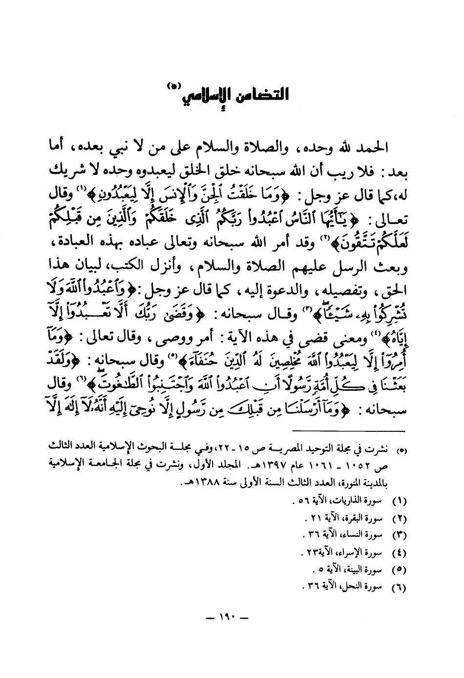 الحمد لله وحده، والصلاة والسلام على من لا نبي بعده، أما بعد: فلا ريب أن الله سبحانه خلق الخلق ليعبدوه وحده لا شريك له، كما قال عز وجل: {وَمَا خَلَقْتُ الْجِنَّ وَالْإِنْسَ إِلَّا لِيَعْبُدُونِ} (¬1) وقال تعالى: {يَا أَيُّهَا النَّاسُ اعْبُدُوا رَبَّكُمُ الَّذِي خَلَقَكُمْ وَالَّذِينَ مِنْ قَبْلِكُمْ لَعَلَّكُمْ تَتَّقُونَ} (¬2) وقد أمر الله سبحانه وتعالى عباده بهذه العبادة، وبعث الرسل عليهم الصلاة والسلام، وأنزل الكتب، لبيان هذا الحق، وتفصيله، والدعوة إليه، كما قال عز وجل: {وَاعْبُدُوا اللَّهَ وَلَا تُشْرِكُوا بِهِ شَيْئًا} (¬3) وقال سبحانه: {وَقَضَى رَبُّكَ أَلَّا تَعْبُدُوا إِلَّا إِيَّاهُ} (¬4) ومعنى قضى في هذه الآية: أمر ووصى، وقال تعالى: {وَمَا أُمِرُوا إِلَّا لِيَعْبُدُوا اللَّهَ مُخْلِصِينَ لَهُ الدِّينَ حُنَفَاءَ} (¬5) وقال سبحانه: {وَلَقَدْ بَعَثْنَا فِي كُلِّ أُمَّةٍ رَسُولًا أَنِ اُعْبُدُوا اللَّهَ وَاجْتَنِبُوا الطَّاغُوتَ} (¬6) وقال سبحانه: {وَمَا أَرْسَلْنَا مِنْ قَبْلِكَ مِنْ رَسُولٍ إِلَّا نُوحِي إِلَيْهِ أَنَّهُ لَا إِلَهَ إِلَّا أَنَا فَاعْبُدُونِ} (¬7)