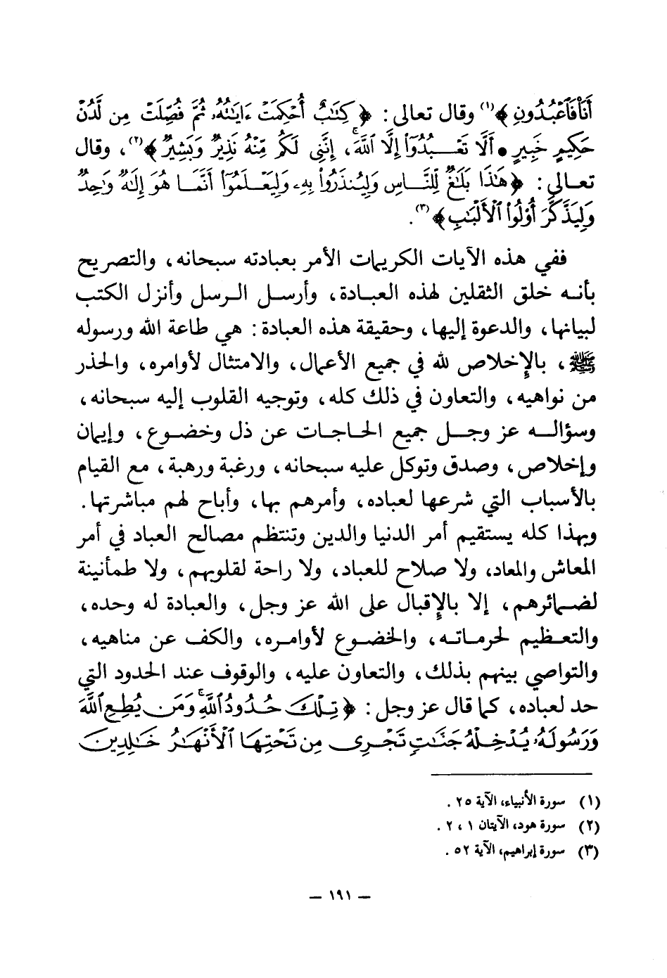 ففي هذه الآيات الكريمات الأمر بعبادته سبحانه، والتصريح بأنه خلق الثقلين لهذه العبادة، وأرسل الرسل وأنزل الكتب لبيانها، والدعوة إليها، وحقيقة هذه العبادة: هي طاعة الله ورسوله صلى الله عليه وسلم، بالإخلاص لله في جميع الأعمال، والامتثال لأوامره، والحذر من نواهيه، والتعاون في ذلك كله، وتوجيه القلوب إليه سبحانه، وسؤاله عز وجل جميع الحاجات عن ذل وخضوع، وإيمان وإخلاص، وصدق وتوكل عليه سبحانه، ورغبة ورهبة، مع القيام بالأسباب التي شرعها لعباده، وأمرهم بها، وأباح لهم مباشرتها. وبهذا كله يستقيم أمر الدنيا والدين وتنتظم مصالح العباد في أمر المعاش والمعاد، ولا صلاح للعباد، ولا راحة لقلوبهم، ولا طمأنينة لضمائرهم، إلا بالإقبال على الله عز وجل، والعبادة له وحده، والتعظيم لحرماته، والخضوع لأوامره، والكف عن مناهيه، والتواصي بينهم بذلك، والتعاون عليه، والوقوف عند الحدود التي حد لعباده، كما قال عز وجل: {تِلْكَ حُدُودُ اللَّهِ وَمَنْ يُطِعِ اللَّهَ وَرَسُولَهُ يُدْخِلْهُ جَنَّاتٍ تَجْرِي مِنْ تَحْتِهَا الْأَنْهَارُ خَالِدِينَ فِيهَا وَذَلِكَ الْفَوْزُ الْعَظِيمُ} (¬4) {وَمَنْ يَعْصِ اللَّهَ وَرَسُولَهُ وَيَتَعَدَّ حُدُودَهُ يُدْخِلْهُ نَارًا خَالِدًا فِيهَا وَلَهُ عَذَابٌ مُهِينٌ} (¬5)