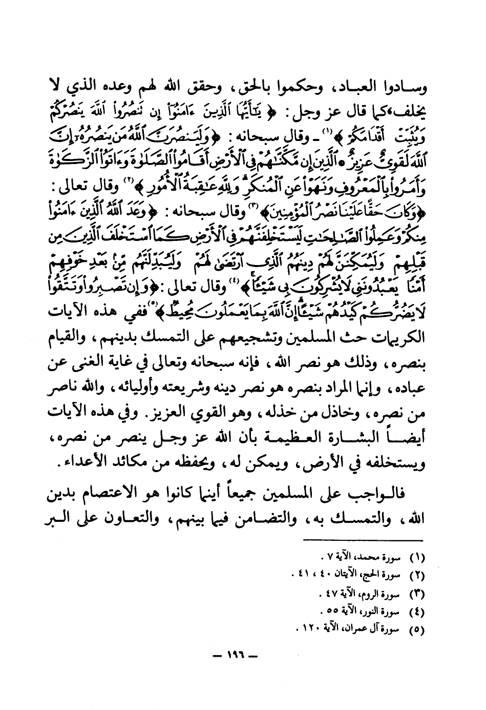 وسادوا العباد، وحكموا بالحق، وحقق الله لهم وعده الذي لا يخلف، كما قال عز وجل: {يَا أَيُّهَا الَّذِينَ آمَنُوا إِنْ تَنْصُرُوا اللَّهَ يَنْصُرْكُمْ وَيُثَبِّتْ أَقْدَامَكُمْ} (¬1) - وقال سبحانه: {وَلَيَنْصُرَنَّ اللَّهُ مَنْ يَنْصُرُهُ إِنَّ اللَّهَ لَقَوِيٌّ عَزِيزٌ} (¬2) {الَّذِينَ إِنْ مَكَّنَّاهُمْ فِي الْأَرْضِ أَقَامُوا الصَّلَاةَ وَآتَوُا الزَّكَاةَ وَأَمَرُوا بِالْمَعْرُوفِ وَنَهَوْا عَنِ الْمُنْكَرِ وَلِلَّهِ عَاقِبَةُ الْأُمُورِ} (¬3) وقال تعالى: {وَكَانَ حَقًّا عَلَيْنَا نَصْرُ الْمُؤْمِنِينَ} (¬4) وقال سبحانه: {وَعَدَ اللَّهُ الَّذِينَ آمَنُوا مِنْكُمْ وَعَمِلُوا الصَّالِحَاتِ لَيَسْتَخْلِفَنَّهُمْ فِي الْأَرْضِ كَمَا اسْتَخْلَفَ الَّذِينَ مِنْ قَبْلِهِمْ وَلَيُمَكِّنَنَّ لَهُمْ دِينَهُمُ الَّذِي ارْتَضَى لَهُمْ وَلَيُبَدِّلَنَّهُمْ مِنْ بَعْدِ خَوْفِهِمْ أَمْنًا يَعْبُدُونَنِي لَا يُشْرِكُونَ بِي شَيْئًا} (¬5) وقال تعالى: {وَإِنْ تَصْبِرُوا وَتَتَّقُوا لَا يَضُرُّكُمْ كَيْدُهُمْ شَيْئًا إِنَّ اللَّهَ بِمَا يَعْمَلُونَ مُحِيطٌ} (¬6) ففي هذه الآيات الكريمات حث المسلمين وتشجيعهم على التمسك بدينهم، والقيام بنصره، وذلك هو نصر الله، فإنه سبحانه وتعالى في غاية الغنى عن عباده، وإنما المراد بنصره هو نصر دينه وشريعته وأوليائه، والله ناصر من نصره، وخاذل من خذله، وهو القوي العزيز.