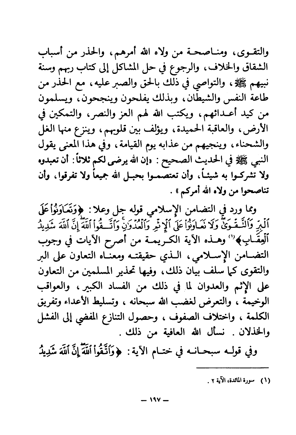 ومما ورد في التضامن الإسلامي قوله جل وعلا: {وَتَعَاوَنُوا عَلَى الْبِرِّ وَالتَّقْوَى وَلَا تَعَاوَنُوا عَلَى الْإِثْمِ وَالْعُدْوَانِ وَاتَّقُوا اللَّهَ إِنَّ اللَّهَ شَدِيدُ الْعِقَابِ} (¬2) وهذه الآية الكريمة من أصرح الآيات في وجوب التضامن الإسلامي، الذي حقيقته ومعناه التعاون على البر والتقوى كما سلف بيان ذلك، وفيها تحذير المسلمين من التعاون على الإثم والعدوان لما في ذلك من الفساد الكبير، والعواقب الوخيمة، والتعرض لغضب الله سبحانه، وتسليط الأعداء وتفريق الكلمة، واختلاف الصفوف، وحصول التنازع المفضي إلى الفشل والخذلان. نسأل الله العافية من ذلك.