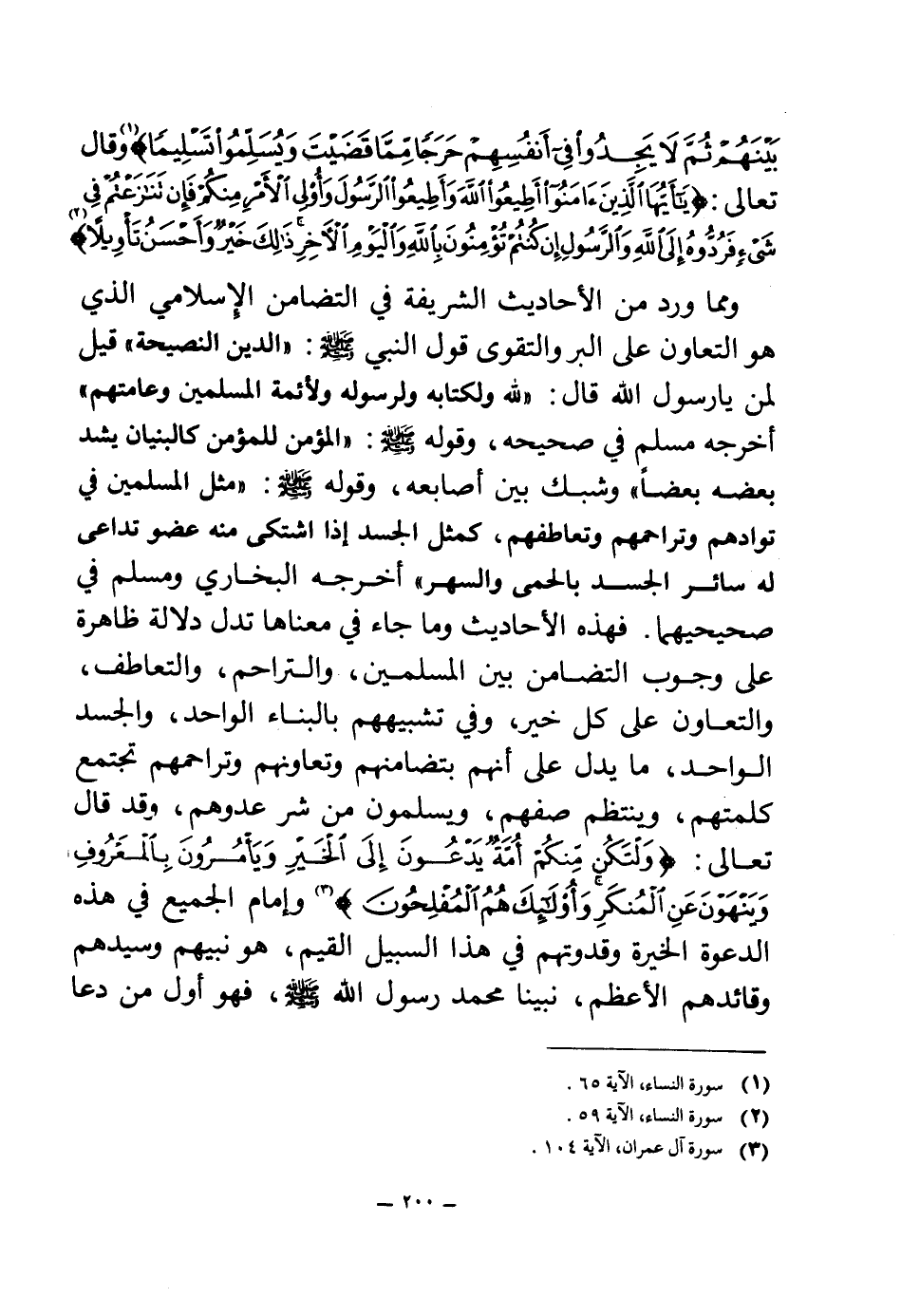 وقال تعالى: {يَا أَيُّهَا الَّذِينَ آمَنُوا أَطِيعُوا اللَّهَ وَأَطِيعُوا الرَّسُولَ وَأُولِي الْأَمْرِ مِنْكُمْ فَإِنْ تَنَازَعْتُمْ فِي شَيْءٍ فَرُدُّوهُ إِلَى اللَّهِ وَالرَّسُولِ إِنْ كُنْتُمْ تُؤْمِنُونَ بِاللَّهِ وَالْيَوْمِ الْآخِرِ ذَلِكَ خَيْرٌ وَأَحْسَنُ تَأْوِيلًا} (¬1) ومما ورد من الأحاديث الشريفة في التضامن الإسلامي الذي هو التعاون على البر والتقوى قول النبي صلى الله عليه وسلم: «الدين النصيحة، قيل: لمن يا رسول الله؟ قال: لله ولكتابه ولرسوله ولأئمة المسلمين وعامتهم (¬2) » أخرجه مسلم في صحيحه، وقوله صلى الله عليه وسلم: «المؤمن للمؤمن كالبنيان يشد بعضه بعضا وشبك بين أصابعه (¬3) » وقوله صلى الله عليه وسلم: «مثل المسلمين في توادهم وتراحمهم وتعاطفهم كمثل الجسد إذا اشتكى منه عضو تداعى له سائر الجسد بالحمى والسهر (¬4) » أخرجه البخاري ومسلم في صحيحيهما.