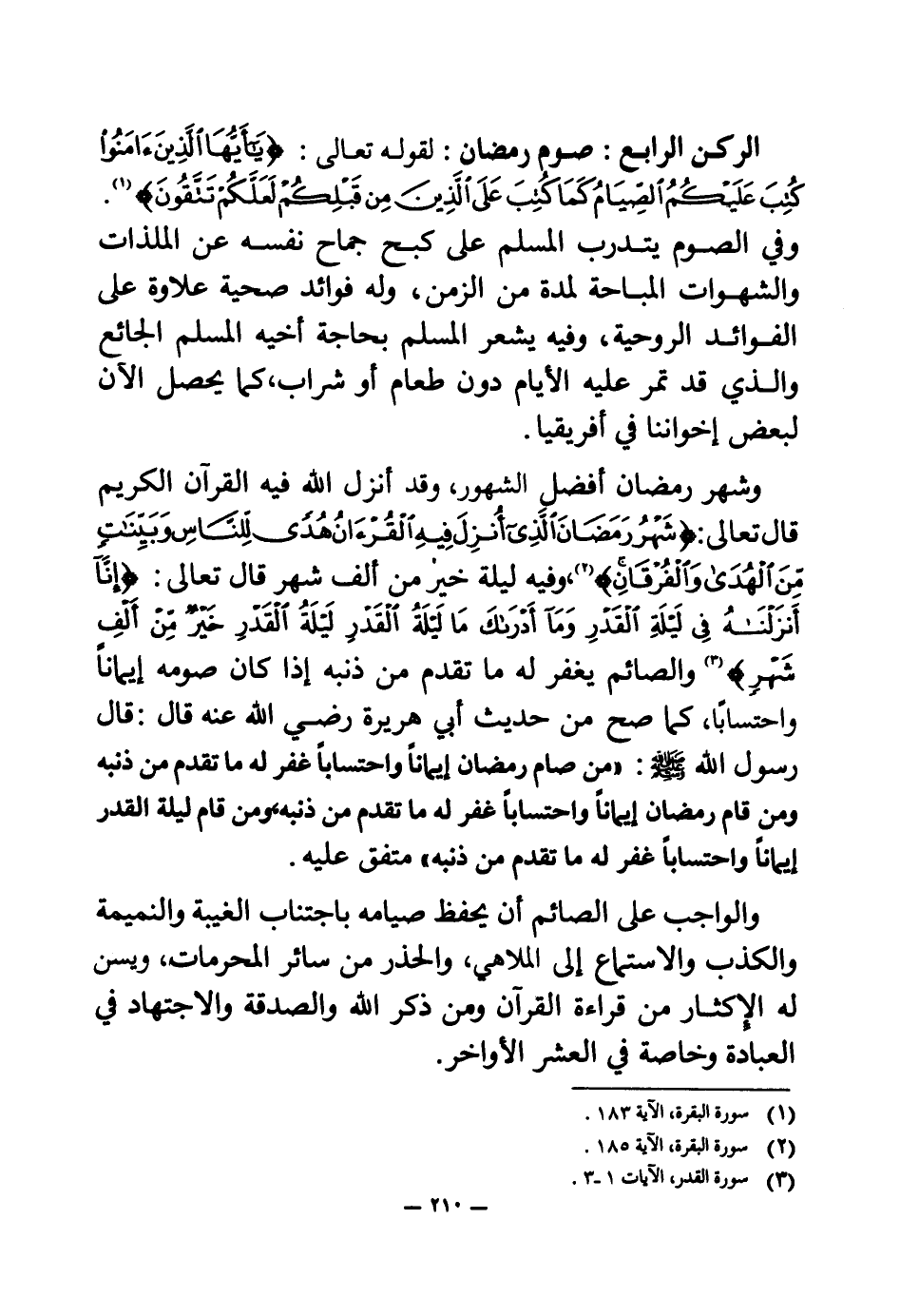 الركن الرابع: صوم رمضان: لقوله تعالى: {يَا أَيُّهَا الَّذِينَ آمَنُوا كُتِبَ عَلَيْكُمُ الصِّيَامُ كَمَا كُتِبَ عَلَى الَّذِينَ مِنْ قَبْلِكُمْ لَعَلَّكُمْ تَتَّقُونَ} (¬1) وفي الصوم يتدرب المسلم على كبح جماح نفسه عن الملذات والشهوات المباحة لمدة من الزمن، وله فوائد صحية علاوة على الفوائد الروحية، وفيه يشعر المسلم بحاجة أخيه المسلم الجائع والذي قد تمر عليه الأيام دون طعام أو شراب، كما يحصل الآن لبعض إخواننا في أفريقيا.