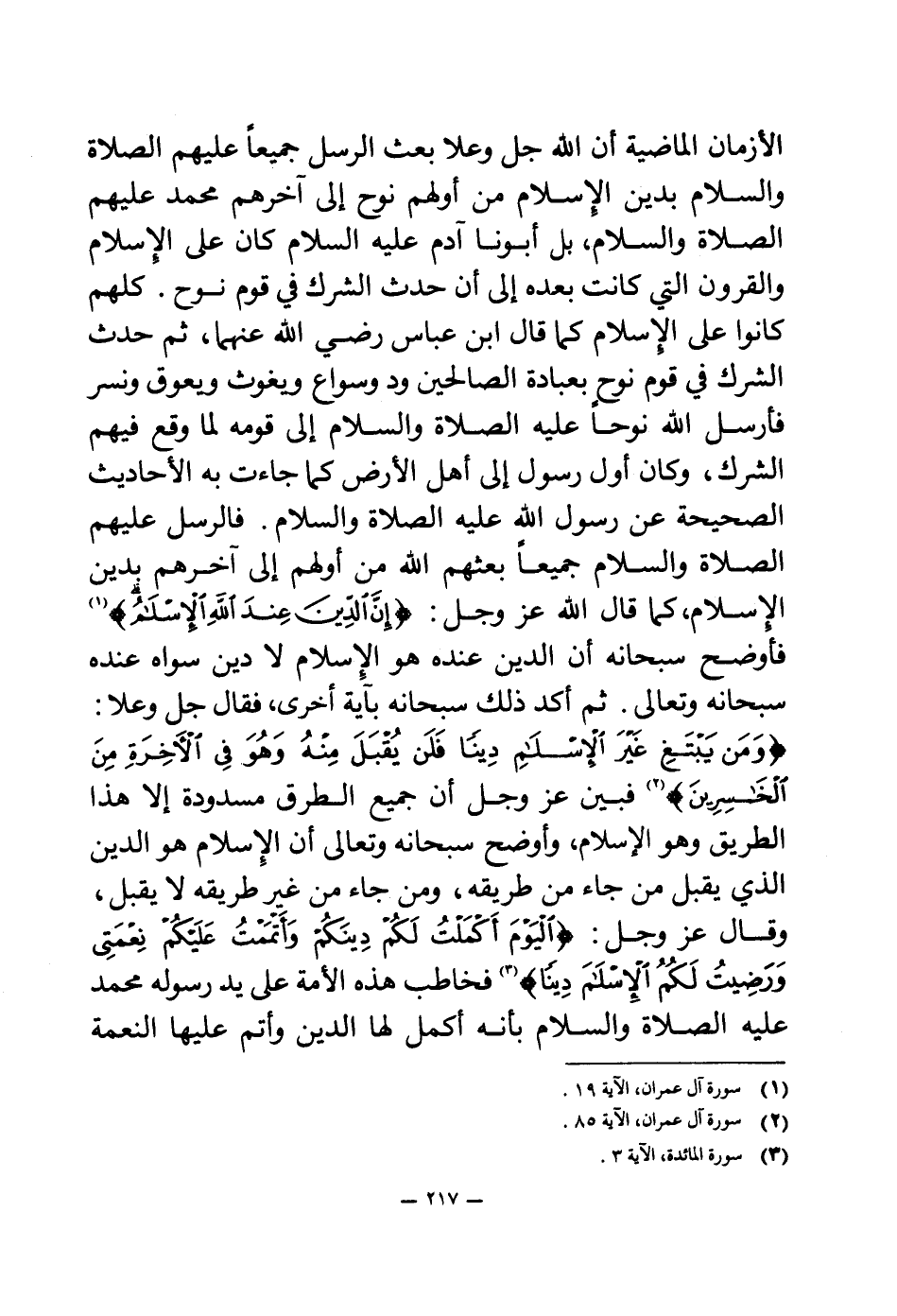الأزمان الماضية أن الله جل وعلا بعث الرسل جميعا عليهم الصلاة والسلام بدين الإسلام من أولهم نوح إلى آخرهم محمد عليهم الصلاة والسلام، بل أبونا آدم عليه السلام كان على الإسلام والقرون التي كانت بعده إلى أن حدث الشرك في قوم نوح. كلهم كانوا على الإسلام كما قال ابن عباس رضي الله عنهما، ثم حدث الشرك في قوم نوح، بعباده الصالحين ود وسواع ويغوث ويعوق ونسر فأرسل الله نوحا عليه الصلاة والسلام إلى قومه لما وقع فيهم الشرك، وكان أول رسول إلى أهل الأرض كما جاءت به الأحاديث الصحيحة عن رسول الله عليه الصلاة والسلام.