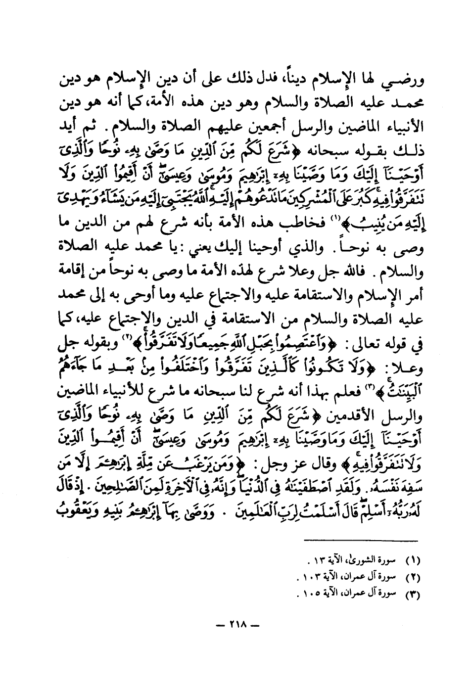ورضي لها الإسلام دينا، فدل ذلك على أن دين الإسلام هو دين محمد عليه الصلاة والسلام وهو دين هذه الأمة، كما أنه هو دين الأنبياء الماضين والرسل أجمعين عليهم الصلاة والسلام. ثم أيد ذلك بقوله سبحانه {شَرَعَ لَكُمْ مِنَ الدِّينِ مَا وَصَّى بِهِ نُوحًا وَالَّذِي أَوْحَيْنَا إِلَيْكَ وَمَا وَصَّيْنَا بِهِ إِبْرَاهِيمَ وَمُوسَى وَعِيسَى أَنْ أَقِيمُوا الدِّينَ وَلَا تَتَفَرَّقُوا فِيهِ كَبُرَ عَلَى الْمُشْرِكِينَ مَا تَدْعُوهُمْ إِلَيْهِ اللَّهُ يَجْتَبِي إِلَيْهِ مَنْ يَشَاءُ وَيَهْدِي إِلَيْهِ مَنْ يُنِيبُ} (¬1) فخاطب هذه الأمة بأنه شرع لهم من الدين ما وصى به نوحا.