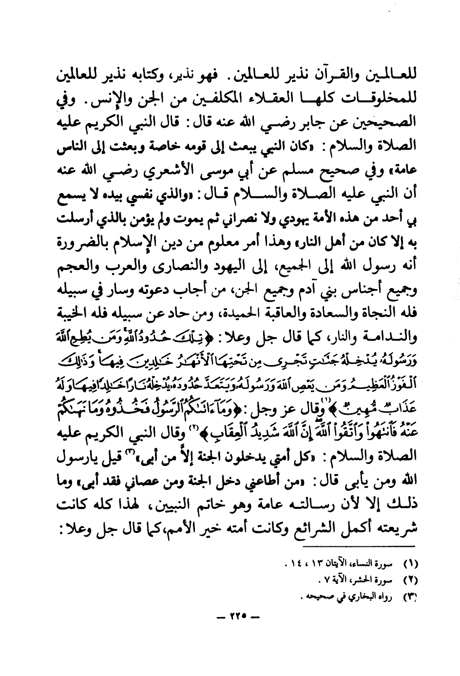 وفي الصحيحين عن جابر رضي الله عنه قال: قال النبي الكريم عليه الصلاة والسلام: «كان النبي يبعث إلى قومه خاصة وبعثت إلى الناس عامة (¬1) » وفي صحيح مسلم عن أبي موسى الأشعري رضي الله عنه أن النبي عليه الصلاة والسلام قال: «والذي نفسي بيده لا يسمع بي أحد من هذه الأمة يهودي ولا نصراني ثم يموت ولم يؤمن بالذي أرسلت به إلا كان من أهل النار (¬2) » وهذا أمر معلوم من دين الإسلام بالضرورة أنه رسول الله إلى الجميع، إلى اليهود والنصارى والعرب والعجم وجميع أجناس بني آدم وجميع الجن، من أجاب دعوته وسار في سبيله فله النجاة والسعادة والعاقبة الحميدة، ومن حاد عن سبيله فله الخيبة والندامة والنار، كما قال جل وعلا: {تِلْكَ حُدُودُ اللَّهِ وَمَنْ يُطِعِ اللَّهَ وَرَسُولَهُ يُدْخِلْهُ جَنَّاتٍ تَجْرِي مِنْ تَحْتِهَا الْأَنْهَارُ خَالِدِينَ فِيهَا وَذَلِكَ الْفَوْزُ الْعَظِيمُ} (¬3) {وَمَنْ يَعْصِ اللَّهَ وَرَسُولَهُ وَيَتَعَدَّ حُدُودَهُ يُدْخِلْهُ نَارًا خَالِدًا فِيهَا وَلَهُ عَذَابٌ مُهِينٌ} (¬4) وقال عز وجل: {وَمَا آتَاكُمُ الرَّسُولُ فَخُذُوهُ وَمَا نَهَاكُمْ عَنْهُ فَانْتَهُوا وَاتَّقُوا اللَّهَ إِنَّ اللَّهَ شَدِيدُ الْعِقَابِ} (¬5) وقال النبي الكريم عليه الصلاة والسلام: «كل أمتي يدخلون الجنة إلا من أبى قيل: يا رسول الله ومن يأبى؟ قال: من أطاعني دخل الجنة ومن عصاني فقد أبى (¬6) » وما ذلك إلا لأن رسالته عامة وهو خاتم النبين، لهذا كله كانت شريعته أكمل الشرائع وكانت أمته خير الأمم، كما قال جل وعلا: