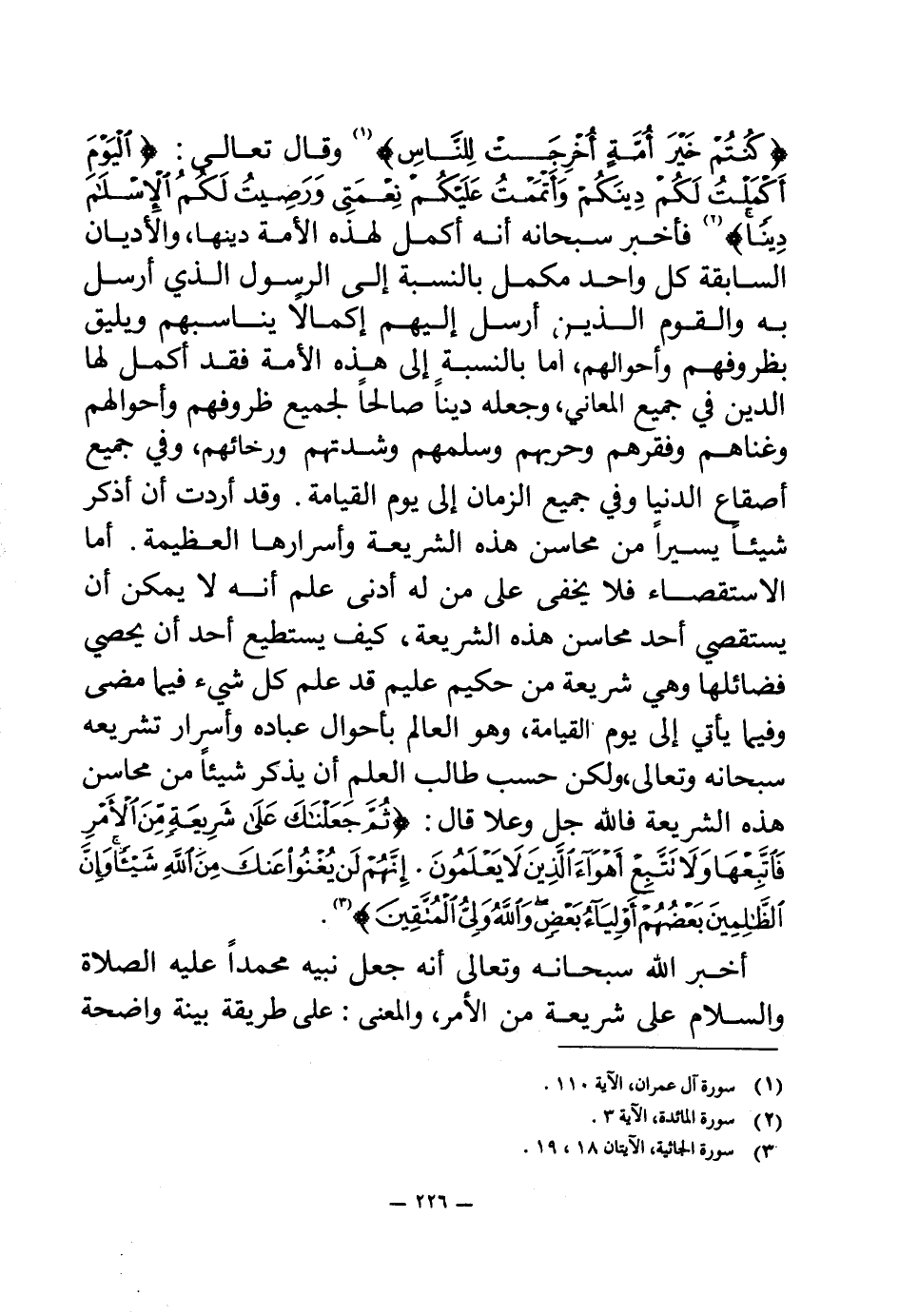 {كُنْتُمْ خَيْرَ أُمَّةٍ أُخْرِجَتْ لِلنَّاسِ} (¬1) وقال تعالى: {الْيَوْمَ أَكْمَلْتُ لَكُمْ دِينَكُمْ وَأَتْمَمْتُ عَلَيْكُمْ نِعْمَتِي وَرَضِيتُ لَكُمُ الْإِسْلَامَ دِينًا} (¬2) فأخبر سبحانه أنه أكمل لهذه الأمة دينها، والأديان السابقة كل واحد مكمل بالنسبة إلى الرسول الذي أرسل به والقوم الذين أرسل إليهم إكمالا يناسبهم ويليق بظروفهم وأحوالهم، أما بالنسبة إلى هذه الأمة فقد أكمل لها الدين في جميع المعاني، وجعله دينا صالحا لجميع ظروفهم وأحوالهم وغناهم وفقرهم وحربهم وسلمهم وشدتهم ورخائهم، وفي جميع أصقاع الدنيا وفي جميع الزمان إلى يوم القيامة.