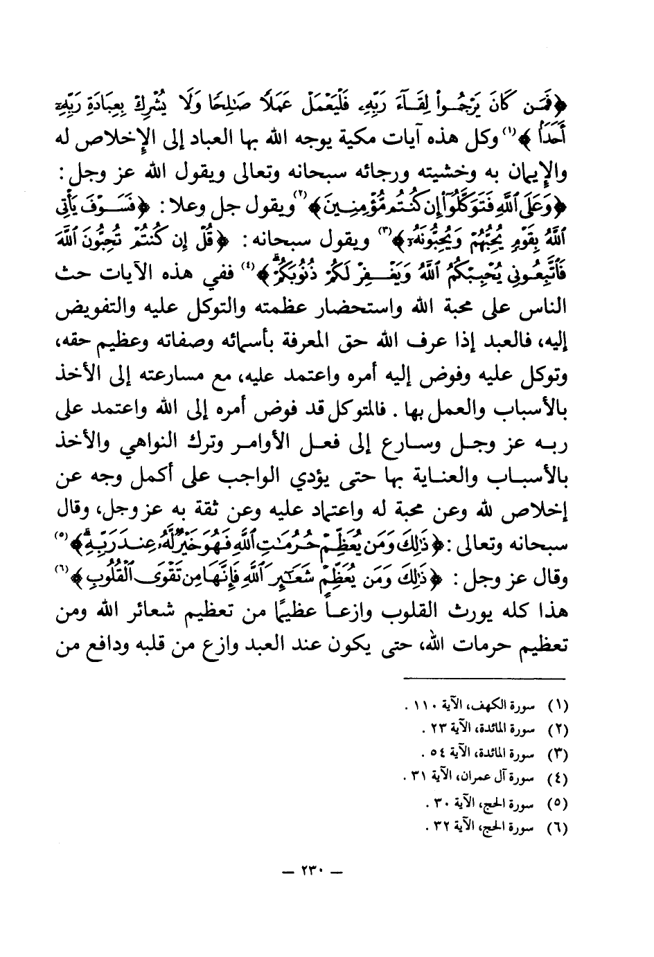 {فَمَنْ كَانَ يَرْجُوا لِقَاءَ رَبِّهِ فَلْيَعْمَلْ عَمَلًا صَالِحًا وَلَا يُشْرِكْ بِعِبَادَةِ رَبِّهِ أَحَدًا} (¬1) وكل هذه آيات مكية يوجه الله بها العباد إلى الإخلاص له والإيمان به وخشيته ورجائه سبحانه وتعالى ويقول الله عز وجل: {وَعَلَى اللَّهِ فَتَوَكَّلُوا إِنْ كُنْتُمْ مُؤْمِنِينَ} (¬2) ويقول جل وعلا: {فَسَوْفَ يَأْتِي اللَّهُ بِقَوْمٍ يُحِبُّهُمْ وَيُحِبُّونَهُ} (¬3) ويقول سبحانه: {قُلْ إِنْ كُنْتُمْ تُحِبُّونَ اللَّهَ فَاتَّبِعُونِي يُحْبِبْكُمُ اللَّهُ وَيَغْفِرْ لَكُمْ ذُنُوبَكُمْ} (¬4) ففي هذه الآيات حث الناس على محبة الله واستحضار عظمته والتوكل عليه والتفويض إليه، فالعبد إذا عرف الله حق المعرفة بأسمائه وصفاته وعظيم حقه، وتوكل عليه وفوض إليه أمره واعتمد عليه، مع مسارعته إلى الأخذ بالأسباب والعمل بها فالمتوكل قد فوض أمره إلى الله واعتمد على ربه عز وجل وسارع إلى فعل الأوامر وترك النواهي والأخذ بالأسباب والعناية بها حتى يؤدي الواجب على أكمل وجه عن إخلاص لله وعن محبة له واعتماد عليه وعن ثقة به عز وجل، وقال سبحانه وتعالى: {ذَلِكَ وَمَنْ يُعَظِّمْ حُرُمَاتِ اللَّهِ فَهُوَ خَيْرٌ لَهُ عِنْدَ رَبِّهِ} (¬5) وقال عز وجل: {ذَلِكَ وَمَنْ يُعَظِّمْ شَعَائِرَ اللَّهِ فَإِنَّهَا مِنْ تَقْوَى الْقُلُوبِ} (¬6) هذا كله يورث القلوب وازعا عظيما من تعظيم شعائر الله ومن تعظيم حرمات الله، حتى يكون عند العبد وازع من قلبه ودافع من