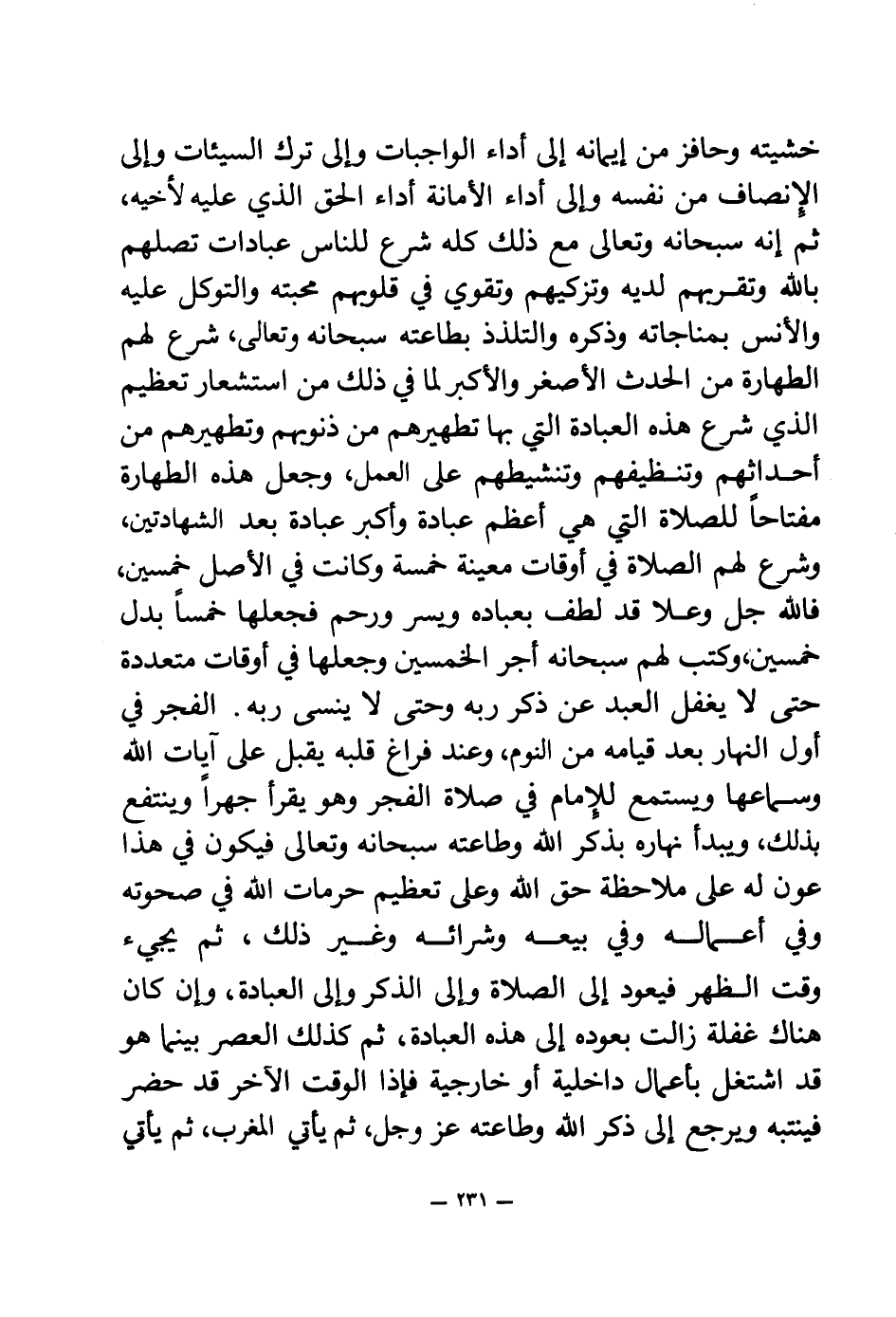 ثم إنه سبحانه وتعالى مع ذلك كله شرع للناس عبادات تصلهم بالله وتقربهم لديه وتزكيهم وتقوي في قلوبهم محبته والتوكل عليه والأنس بمناجاته وذكره والتلذذ بطاعته سبحانه وتعالى، شرع لهم الطهارة من الحدث الأصغر والأكبر لما في ذلك من استشعار تعظيم الذي شرع هذه العبادة التي بها تطهيرهم من ذنوبهم وتطهيرهم من أحداثهم وتنطيفهم وتنشيطهم على العمل، وجعل هذه الطهارة مفتاحا للصلاة التي هي أعظم عبادة وأكبر عبادة بعد الشهادتين وشرع لهم الصلاة في أوقات معينة خمسة وكانت في الأصل خمسين، فالله جل وعلا قد لطف بعباده ويسر ورحم فجعلها خمسا بدل خمسين، وكتب لهم سبحانه أجر الخمسين وجعلها في أوقات متعددة حتى لا يغفل العبد عن ذكر ربه وحتى لا ينسى ربه.