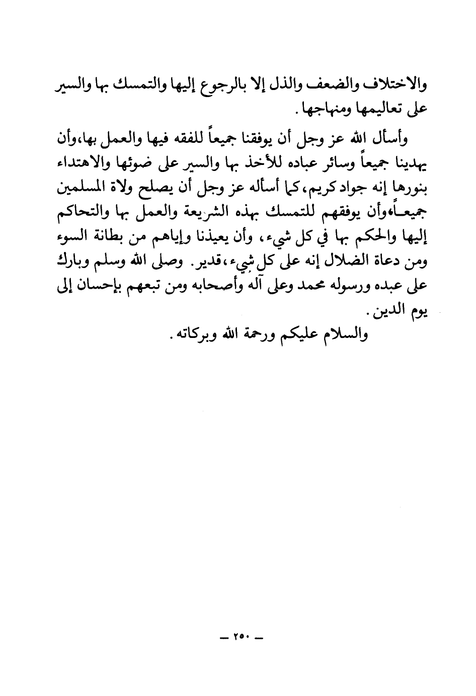 وأسال الله عز وجل أن يوفقنا جميعا للفقه فيها والعمل بها، وأن يهدينا جميعا وسائر عباده للأخذ بها والسير على ضوئها والاهتداء بنورها إنه جواد كريم، كما أسأله عز وجل أن يصلح ولاة المسلمين جميعا، وأن يوفقهم للتمسك بهذه الشريعة والعمل بها والتحاكم إليها والحكم بها في كل شيء، وأن يعيذنا وإياهم من بطانة السوء ومن دعاة الضلال إنه على كل شيء، قدير وصلى الله وسلم وبارك على عبده ورسوله محمد وعلى آله وأصحابه ومن تبعهم بإحسان إلى يوم الدين. والسلام عليكم ورحمة الله وبركاته.