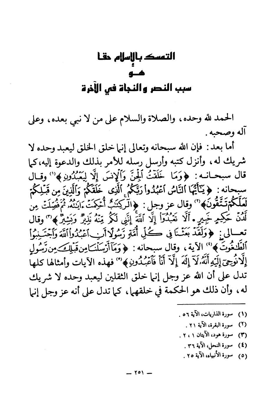 أما بعد: فإن الله سبحانه وتعالى إنما خلق الخلق ليعبد وحده لا شريك له، وأنزل كتبه وأرسل رسله للأمر بذلك والدعوة إليه، كما قال سبحانه: {وَمَا خَلَقْتُ الْجِنَّ وَالْإِنْسَ إِلَّا لِيَعْبُدُونِ} (¬1) وقال سبحانه: {يَا أَيُّهَا النَّاسُ اعْبُدُوا رَبَّكُمُ الَّذِي خَلَقَكُمْ وَالَّذِينَ مِنْ قَبْلِكُمْ لَعَلَّكُمْ تَتَّقُونَ} (¬2) وقال عز وجل: {الر كِتَابٌ أُحْكِمَتْ آيَاتُهُ ثُمَّ فُصِّلَتْ مِنْ لَدُنْ حَكِيمٍ خَبِيرٍ} (¬3) {أَلَّا تَعْبُدُوا إِلَّا اللَّهَ إِنَّنِي لَكُمْ مِنْهُ نَذِيرٌ وَبَشِيرٌ} (¬4) وقال تعالى {وَلَقَدْ بَعَثْنَا فِي كُلِّ أُمَّةٍ رَسُولًا أَنِ اُعْبُدُوا اللَّهَ وَاجْتَنِبُوا الطَّاغُوتَ} (¬5) الآية، وقال سبحانه: {وَمَا أَرْسَلْنَا مِنْ قَبْلِكَ مِنْ رَسُولٍ إِلَّا نُوحِي إِلَيْهِ أَنَّهُ لَا إِلَهَ إِلَّا أَنَا فَاعْبُدُونِ} (¬6) فهذه الآيات وأمثالها كلها تدل على أن الله عز وجل إنما خلق الثقلين ليعبد وحده لا شريك له، وأن ذلك هو الحكمة في خلقهما، كما تدل على أنه عز وجل إنما