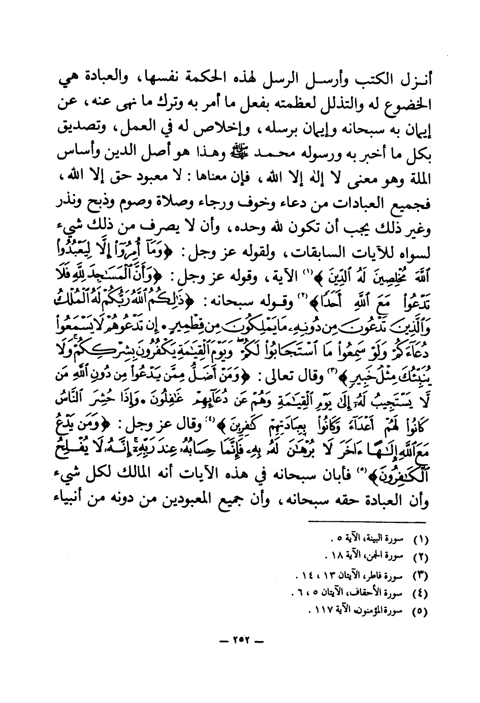 أنزل الكتب وأرسل الرسل لهذه الحكمة نفسها، والعبادة هي الخضوع له والتذلل لعظمته بفعل ما أمر به وترك ما نهى عنه، عن إيمان به سبحانه وإيمان برسله، وإخلاص له في العمل، وتصديق بكل ما أخبر به ورسوله محمد صلى الله عليه وسلم وهذا هو أصل الدين وأساس الملة وهو معنى لا إله إلا الله، فإن معناها: لا معبود حق إلا الله، فجميع العبادات من دعاء وخوف ورجاء وصلاة وصوم وذبح ونذر وغير ذلك يجب أن تكون لله وحده، وأن لا يصرف من ذلك شيء لسواه للآيات السابقات، ولقوله عز وجل: {وَمَا أُمِرُوا إِلَّا لِيَعْبُدُوا اللَّهَ مُخْلِصِينَ لَهُ الدِّينَ} (¬1) الآية، وقوله عز وجل: {وَأَنَّ الْمَسَاجِدَ لِلَّهِ فَلَا تَدْعُوا مَعَ اللَّهِ أَحَدًا} (¬2) وقوله سبحانه: {ذَلِكُمُ اللَّهُ رَبُّكُمْ لَهُ الْمُلْكُ وَالَّذِينَ تَدْعُونَ مِنْ دُونِهِ مَا يَمْلِكُونَ مِنْ قِطْمِيرٍ} (¬3) {إِنْ تَدْعُوهُمْ لَا يَسْمَعُوا دُعَاءَكُمْ وَلَوْ سَمِعُوا مَا اسْتَجَابُوا لَكُمْ وَيَوْمَ الْقِيَامَةِ يَكْفُرُونَ بِشِرْكِكُمْ وَلَا يُنَبِّئُكَ مِثْلُ خَبِيرٍ} (¬4) وقال تعالى: {وَمَنْ أَضَلُّ مِمَّنْ يَدْعُو مِنْ دُونِ اللَّهِ مَنْ لَا يَسْتَجِيبُ لَهُ إِلَى يَوْمِ الْقِيَامَةِ وَهُمْ عَنْ دُعَائِهِمْ غَافِلُونَ} (¬5) {وَإِذَا حُشِرَ النَّاسُ كَانُوا لَهُمْ أَعْدَاءً وَكَانُوا بِعِبَادَتِهِمْ كَافِرِينَ} (¬6) وقال عز وجل: {وَمَنْ يَدْعُ مَعَ اللَّهِ إِلَهًا آخَرَ لَا بُرْهَانَ لَهُ بِهِ فَإِنَّمَا حِسَابُهُ عِنْدَ رَبِّهِ إِنَّهُ لَا يُفْلِحُ الْكَافِرُونَ} (¬7) فأبان سبحانه في هذه الآيات أنه المالك لكل شيء وأن العبادة حقه سبحانه، وأن جميع المعبودين من دونه من أنبياء