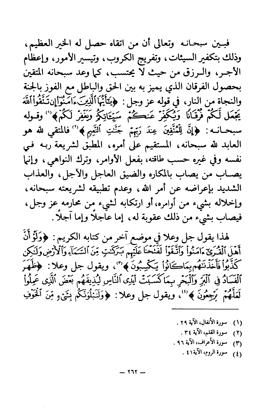 لهذا يقول جل وعلا في موضع آخر من كتابه الكريم: {وَلَوْ أَنَّ أَهْلَ الْقُرَى آمَنُوا وَاتَّقَوْا لَفَتَحْنَا عَلَيْهِمْ بَرَكَاتٍ مِنَ السَّمَاءِ وَالْأَرْضِ وَلَكِنْ كَذَّبُوا فَأَخَذْنَاهُمْ بِمَا كَانُوا يَكْسِبُونَ} (¬3) ويقول جل وعلا: {ظَهَرَ الْفَسَادُ فِي الْبَرِّ وَالْبَحْرِ بِمَا كَسَبَتْ أَيْدِي النَّاسِ لِيُذِيقَهُمْ بَعْضَ الَّذِي عَمِلُوا لَعَلَّهُمْ يَرْجِعُونَ} (¬4) ويقول جل وعلا: {وَلَنَبْلُوَنَّكُمْ بِشَيْءٍ مِنَ الْخَوْفِ وَالْجُوعِ وَنَقْصٍ مِنَ الْأَمْوَالِ وَالْأَنْفُسِ وَالثَّمَرَاتِ وَبَشِّرِ الصَّابِرِينَ} (¬5)