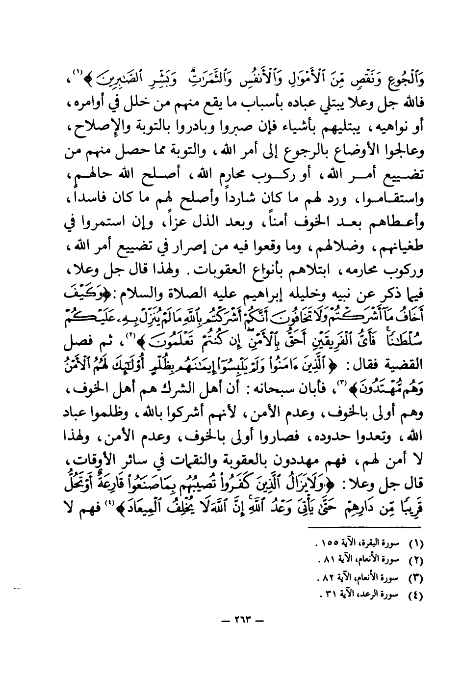 ولهذا قال جل وعلا، فيما ذكر عن نبيه وخليله إبراهيم عليه الصلاة والسلام: {وَكَيْفَ أَخَافُ مَا أَشْرَكْتُمْ وَلَا تَخَافُونَ أَنَّكُمْ أَشْرَكْتُمْ بِاللَّهِ مَا لَمْ يُنَزِّلْ بِهِ عَلَيْكُمْ سُلْطَانًا فَأَيُّ الْفَرِيقَيْنِ أَحَقُّ بِالْأَمْنِ إِنْ كُنْتُمْ تَعْلَمُونَ} (¬1) ثم فصل القضية فقال: {الَّذِينَ آمَنُوا وَلَمْ يَلْبِسُوا إِيمَانَهُمْ بِظُلْمٍ أُولَئِكَ لَهُمُ الْأَمْنُ وَهُمْ مُهْتَدُونَ} (¬2) فأبان سبحانه: أن أهل الشرك هم أهل الخوف، وهم أولى بالخوف، وعدم الأمن، لأنهم أشركوا بالله وظلموا عباد الله، وتعدوا حدوده، فصاروا أولى بالخوف، وعدم الأمن، ولهذا لا أمن لهم، فهم مهددون بالعقوبة والنقمات في سائر الأوقات، قال جل وعلا: {وَلَا يَزَالُ الَّذِينَ كَفَرُوا تُصِيبُهُمْ بِمَا صَنَعُوا قَارِعَةٌ أَوْ تَحُلُّ قَرِيبًا مِنْ دَارِهِمْ حَتَّى يَأْتِيَ وَعْدُ اللَّهِ إِنَّ اللَّهَ لَا يُخْلِفُ الْمِيعَادَ} (¬3) فهم لا