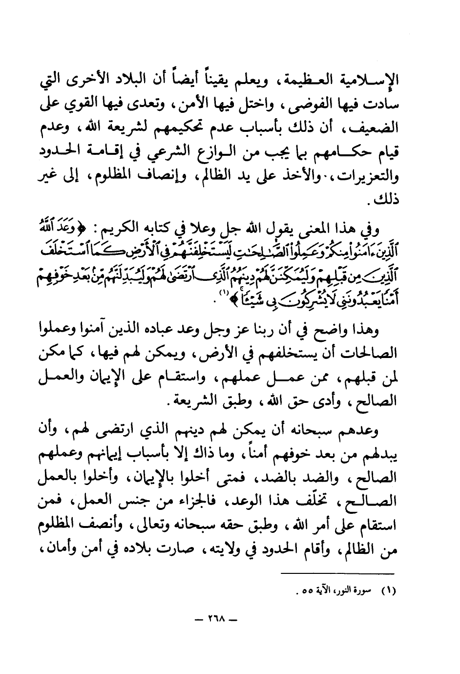 وفي هذا المعنى يقول الله جل وعلا في كتابه الكريم: {وَعَدَ اللَّهُ الَّذِينَ آمَنُوا مِنْكُمْ وَعَمِلُوا الصَّالِحَاتِ لَيَسْتَخْلِفَنَّهُمْ فِي الْأَرْضِ كَمَا اسْتَخْلَفَ الَّذِينَ مِنْ قَبْلِهِمْ وَلَيُمَكِّنَنَّ لَهُمْ دِينَهُمُ الَّذِي ارْتَضَى لَهُمْ وَلَيُبَدِّلَنَّهُمْ مِنْ بَعْدِ خَوْفِهِمْ أَمْنًا يَعْبُدُونَنِي لَا يُشْرِكُونَ بِي شَيْئًا} (¬1)