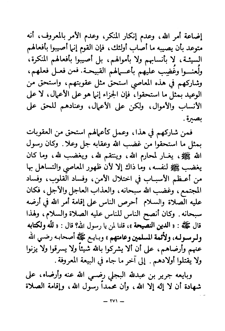 وكان رسول الله - صلى الله عليه وسلم -، يغار لمحارم الله، وينتقم لله، ويغضب لله، وما كان يغضب - صلى الله عليه وسلم - لنفسه، وما ذاك إلا لأن ظهور المعاصي والتساهل بها من أعظم الأسباب في اختلال الأمن، وفساد القلوب، وفساد المجتمع، وغضب الله سبحانه، والعذاب العاجل والآجل، فكان - عليه الصلاة والسلام - أحرص الناس على إقامة أمر الله في أرضه سبحانه. وكان أنصح الناس للناس - عليه الصلاة والسلام -، ولهذا قال - صلى الله عليه وسلم -: «الدين النصيحة قلنا لمن يا رسول الله؟ قال: لله ولكتابه ولرسوله ولأئمة المسلمين وعامتهم (¬1) » «وبايع - صلى الله عليه وسلم - أصحابه - رضي الله عنهم - وأرضاهم، على أن ألا يشركوا بالله شيئا ولا يسرقوا ولا يزنوا ولا يقتلوا أولادهم (¬2) » . إلى آخر ما جاء في البيعة المعروفة.