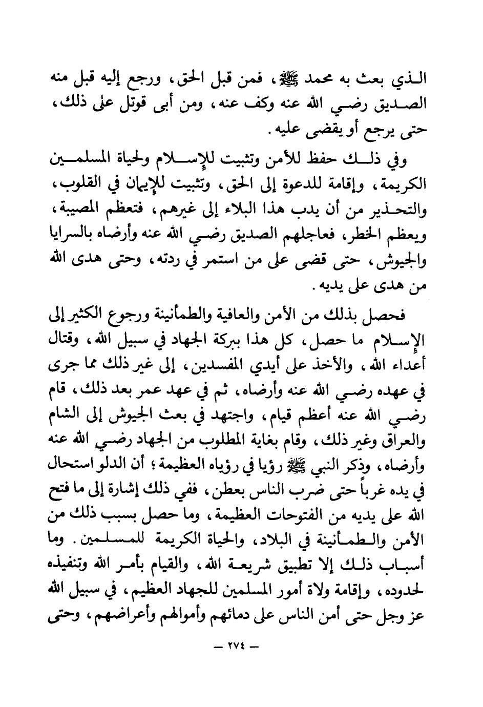 فحصل بذلك من الأمن والعافية والطمأنينة ورجوع الكثير إلى الإسلام ما حصل، كل هذا ببركة الجهاد في سبيل الله، وقتال أعداء الله، والأخذ على أيدي المفسدين، إلى غير ذلك مما جرى في عهده - رضي الله عنه وأرضاه -، ثم في عهد عمر بعد ذلك، قام - رضي الله عنه - أعظم قيام، واجتهد في بعث الجيوش إلى الشام والعراق وغير ذلك، وقام بغاية المطلوب من الجهاد - رضي الله عنه وأرضاه -، وذكر النبي - صلى الله عليه وسلم - رؤيا في رؤياه العظيمة؛ أن الدلو استحال في يده غربا حتى ضرب الناس بعطن، ففي ذلك إشارة إلى ما فتح الله على يديه من الفتوحات العظيمة، وما حصل بسبب ذلك من الأمن والطمأنينة في البلاد، والحياة الكريمة للمسلمين. وما أسباب ذلك إلا تطبيق شريعة الله، والقيام بأمر الله وتنفيذه لحدوده، وإقامة ولاة أمور المسلمين للجهاد العظيم، في سبيل الله عز وجل حتى أمن الناس على دمائهم وأموالهم وأعراضهم، وحتى