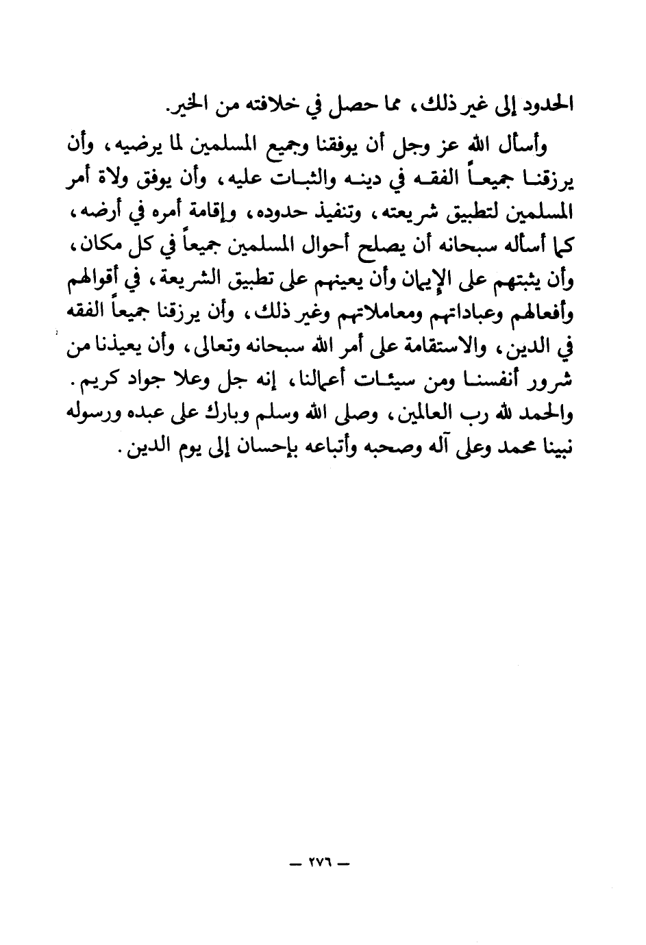 وأسأل الله عز وجل أن يوفقنا وجميع المسلمين لما يرضيه، وأن يرزقنا جميعا الفقه في دينه والثبات عليه، وأن يوفق ولاة أمر المسلمين لتطبيق شريعته، وتنفيذ حدوده، وإقامة أمره في أرضه، كما أسأله سبحانه أن يصلح أحوال المسلمين جميعا في كل مكان، وأن يثبتهم على الإيمان وأن يعينهم على تطبيق الشريعة، في أقوالهم وأفعالهم وعباداتهم ومعاملاتهم وغير ذلك، وأن يرزقنا جميعا الفقه في الدين، والاستقامة على أمر الله سبحانه وتعالى، وأن يعيذنا من شرور أنفسنا ومن سيئات أعمالنا، إنه جل وعلا جواد كريم. والحمد لله رب العالمن، وصلى الله وسلم وبارك على عبده ورسوله نبينا محمد وعلى آله وصحبه وأتباعه بإحسان إلى يوم الدين.