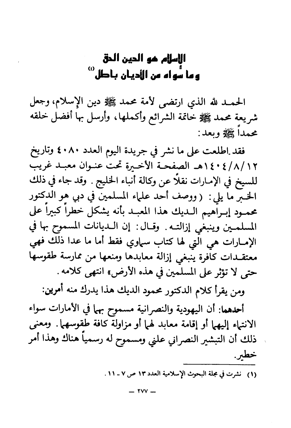 فقد- اطلعت على ما نشر في جريدة اليوم العدد 4080 وتاريخ 12\8\1404 هـ الصفحة الأخيرة تحت عنوان معبد غريب للسيخ في الإمارات نقلا عن وكالة أنباء الخليج. وقد جاء في ذلك الخبر ما يلي: (ووصف أحد علماء المسلمين في دبي هو الدكتور محمود إبراهيم الديك هذا المعبد بأنه يشكل خطرا كبيرا على المسلمين وينبغي إزالته. وقال: إن الديانات المسموح بها في الإمارات هي التي لها كتاب سماوي فقط أما ما عدا ذلك فهي معتقدات كافرة ينبغي إزالة معابدها ومنعها من ممارسة طقوسها حتى لا تؤثر على المسلمين في هذه الأرض" انتهى كلامه.