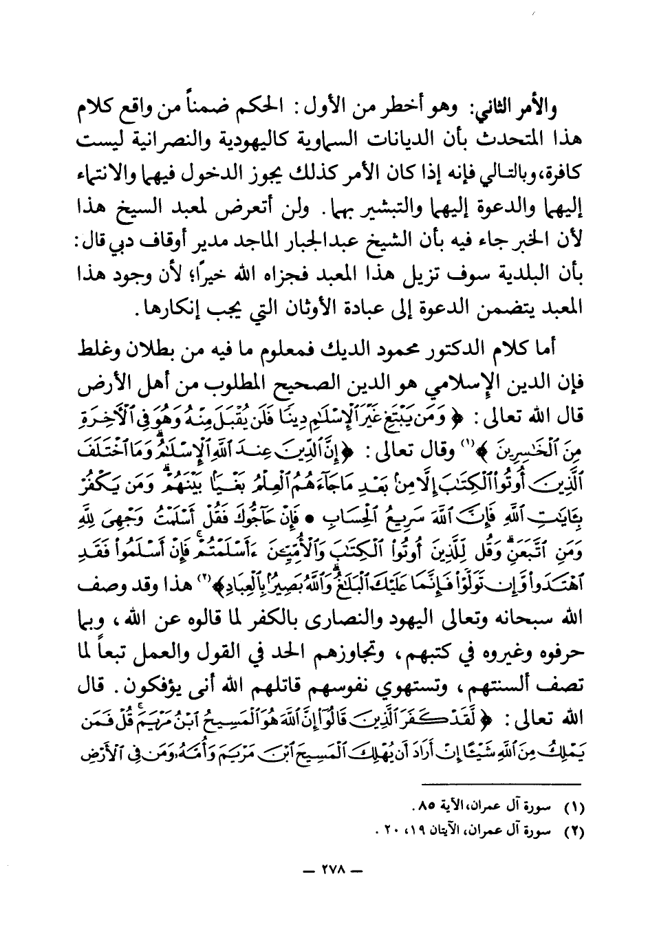 والأمر الثاني: وهو أخطر من الأول: الحكم ضمنا من واقع كلام هذا المتحدث بأن الديانات السماوية كاليهودية والنصرانية ليست كافرة، وبالتالي فإنه إذا كان الأمر كذلك يجوز الدخول فيهما والانتماء إليهما والدعوة إليهما والتبشير بهما. ولن أتعرض لمعبد السيخ هذا لأن الخبر جاء فيه بأن الشيخ عبد الجبار الماجد مدير أوقاف دبي قال: بأن البلدية سوف تزيل هذا المعبد فجزاه الله خيرا؛ لأن وجود هذا المعبد يتضمن الدعوة إلى عبادة الأوثان التي يجب إنكارها.