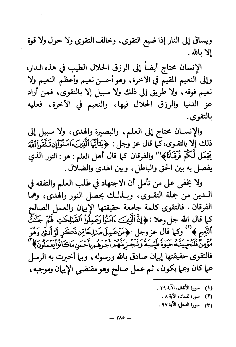 ولا يخفى على من تأمل أن الاجتهاد في طلب العلم والتفقه في الدين من جملة التقوى، وبذلك يحصل النور والهدى، وهما الفرقان. فالتقوى كلمة جامعة حقيقتها الإيمان والعمل الصالح كما قال الله جل وعلا: {إِنَّ الَّذِينَ آمَنُوا وَعَمِلُوا الصَّالِحَاتِ لَهُمْ جَنَّاتُ النَّعِيمِ} (¬2) وكما قال عز وجل: {مَنْ عَمِلَ صَالِحًا مِنْ ذَكَرٍ أَوْ أُنْثَى وَهُوَ مُؤْمِنٌ فَلَنُحْيِيَنَّهُ حَيَاةً طَيِّبَةً وَلَنَجْزِيَنَّهُمْ أَجْرَهُمْ بِأَحْسَنِ مَا كَانُوا يَعْمَلُونَ} (¬3) فالتقوى حقيقتها إيمان صادق بالله ورسوله، وبما أخبرت به الرسل عما كان وعما يكون، ثم عمل صالح وهو مقتضى الإيمان وموجبه،